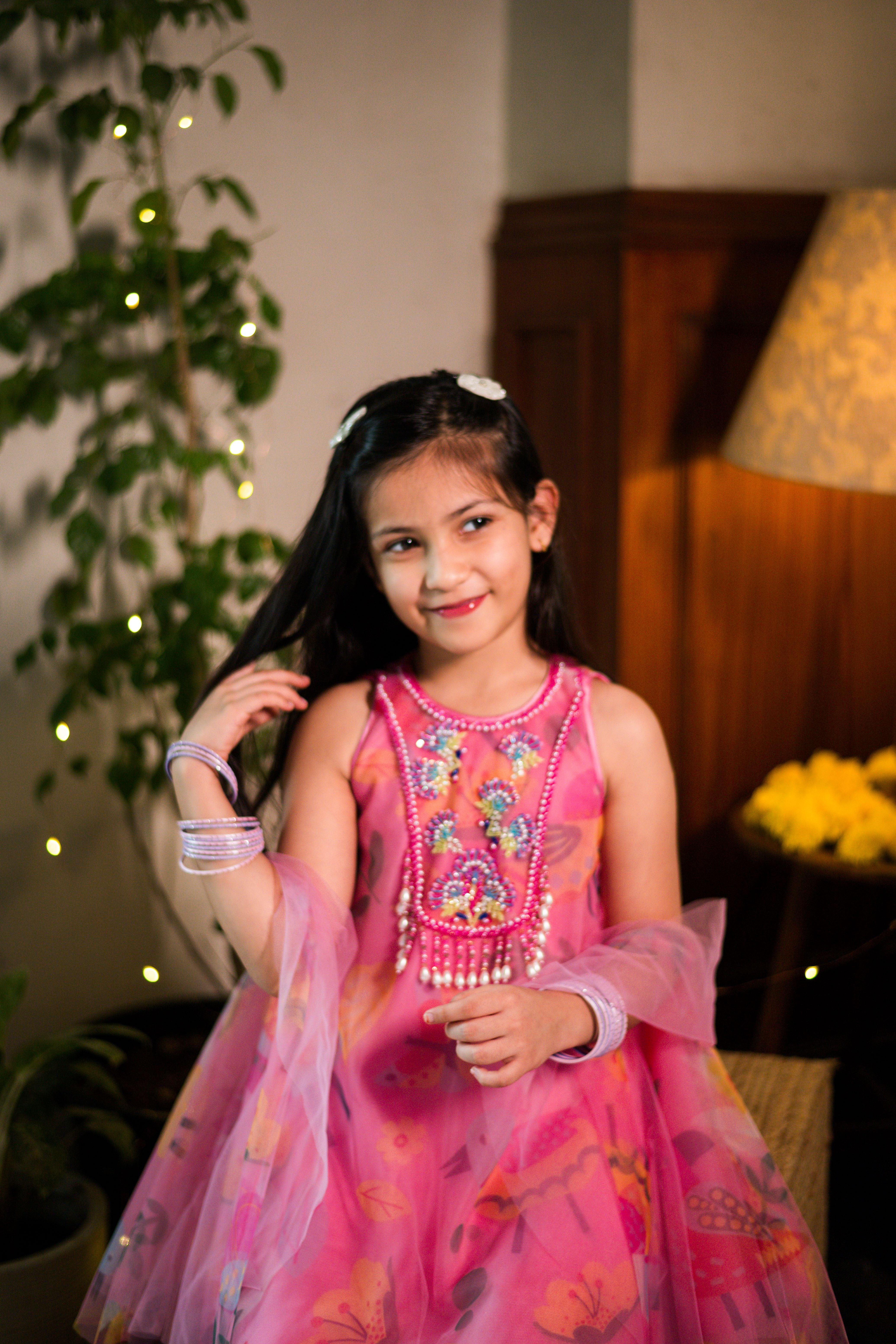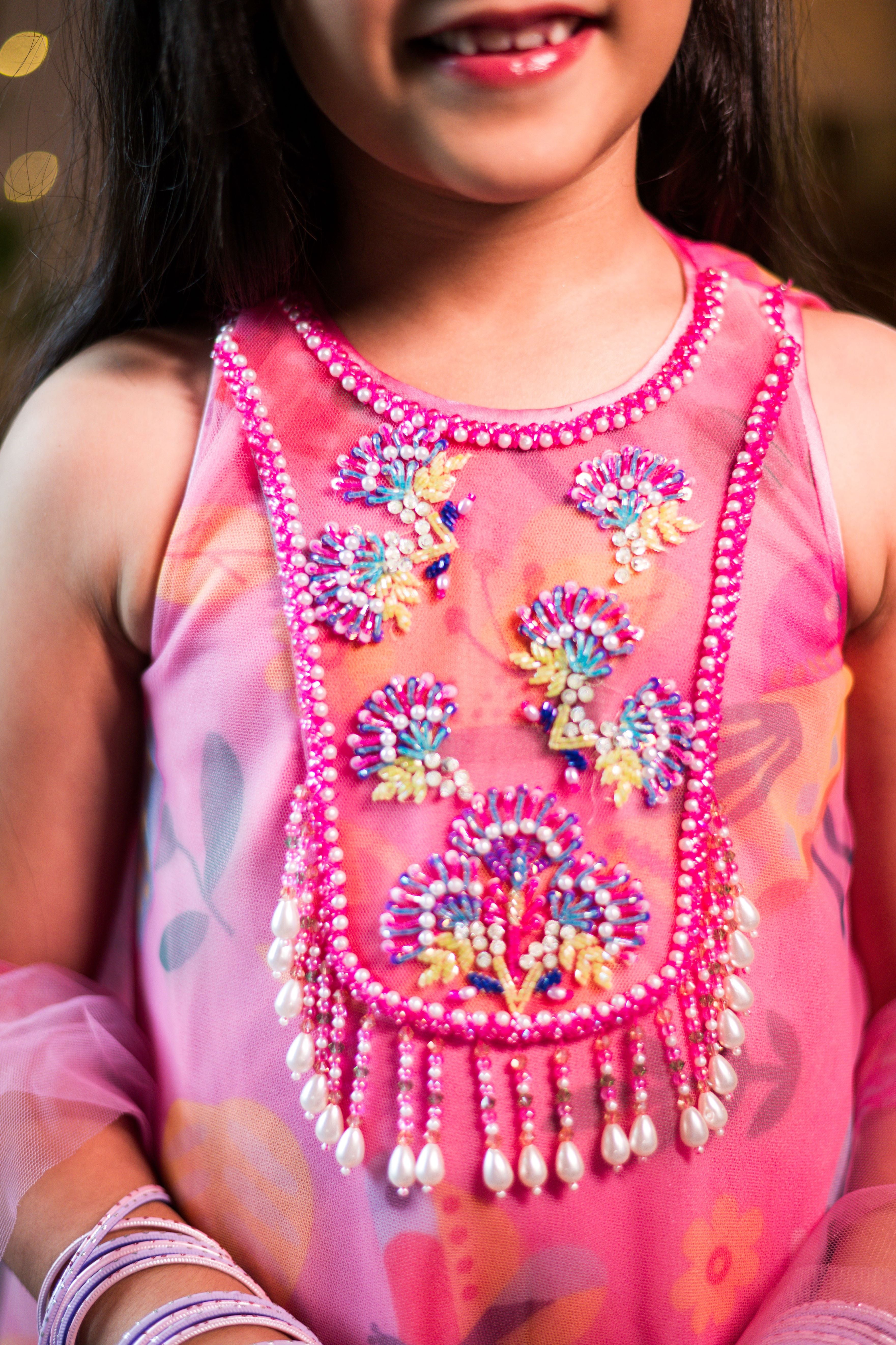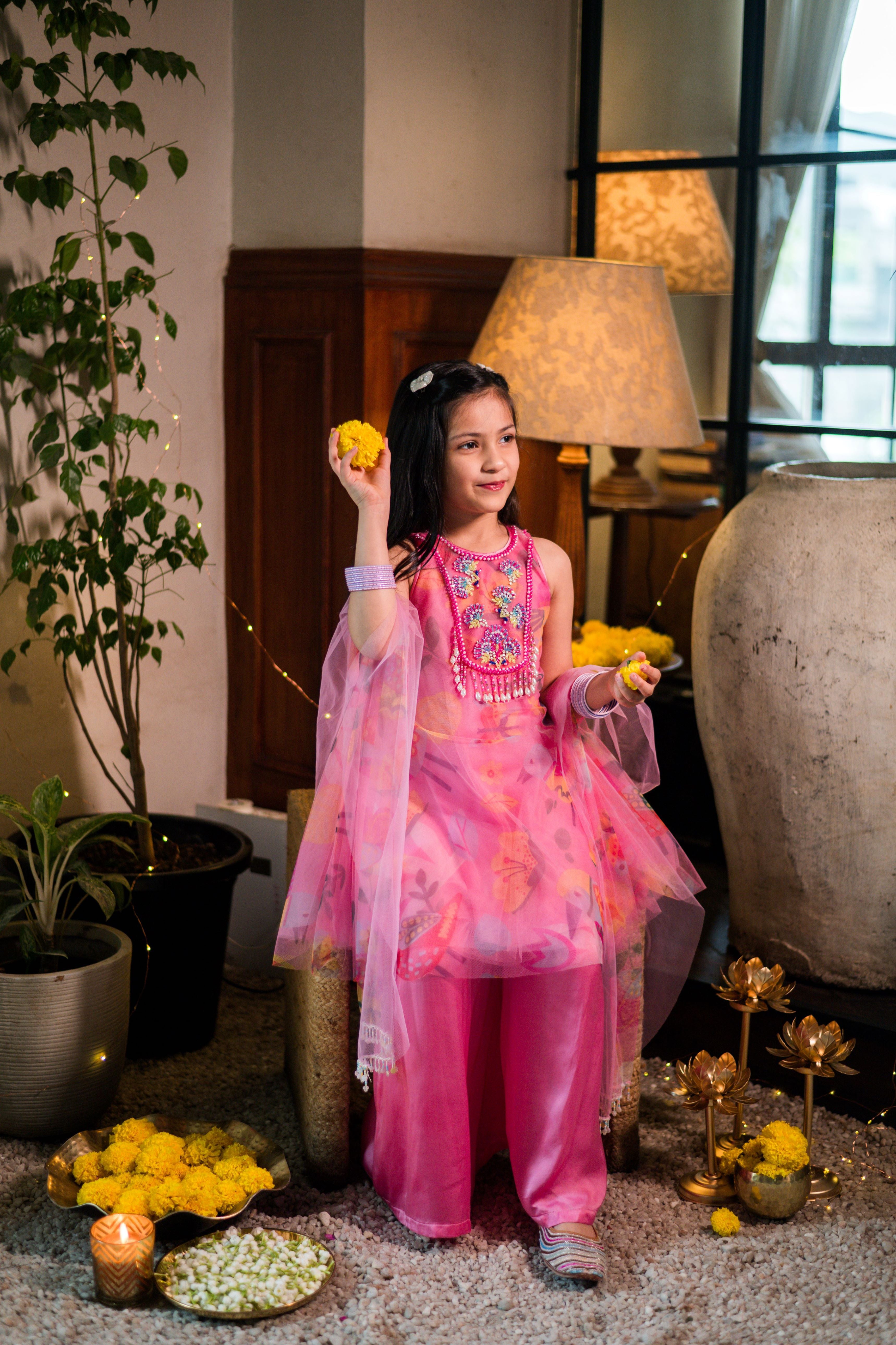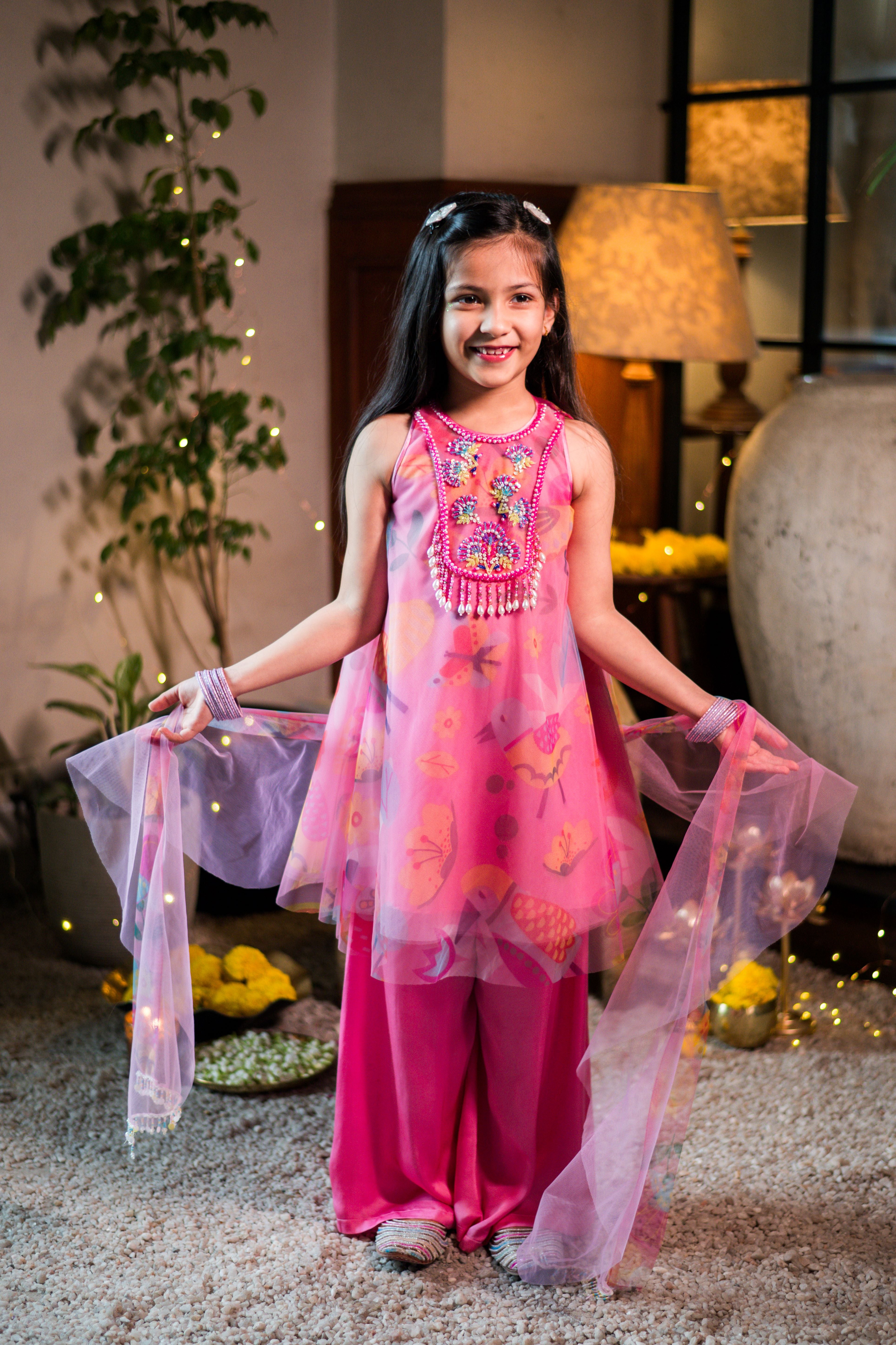 Pink flare in-house print tulle kurti paired with a buttery soft satin silk palazzo with hand embroidered neck details and tassels. Comes with a dupatta.