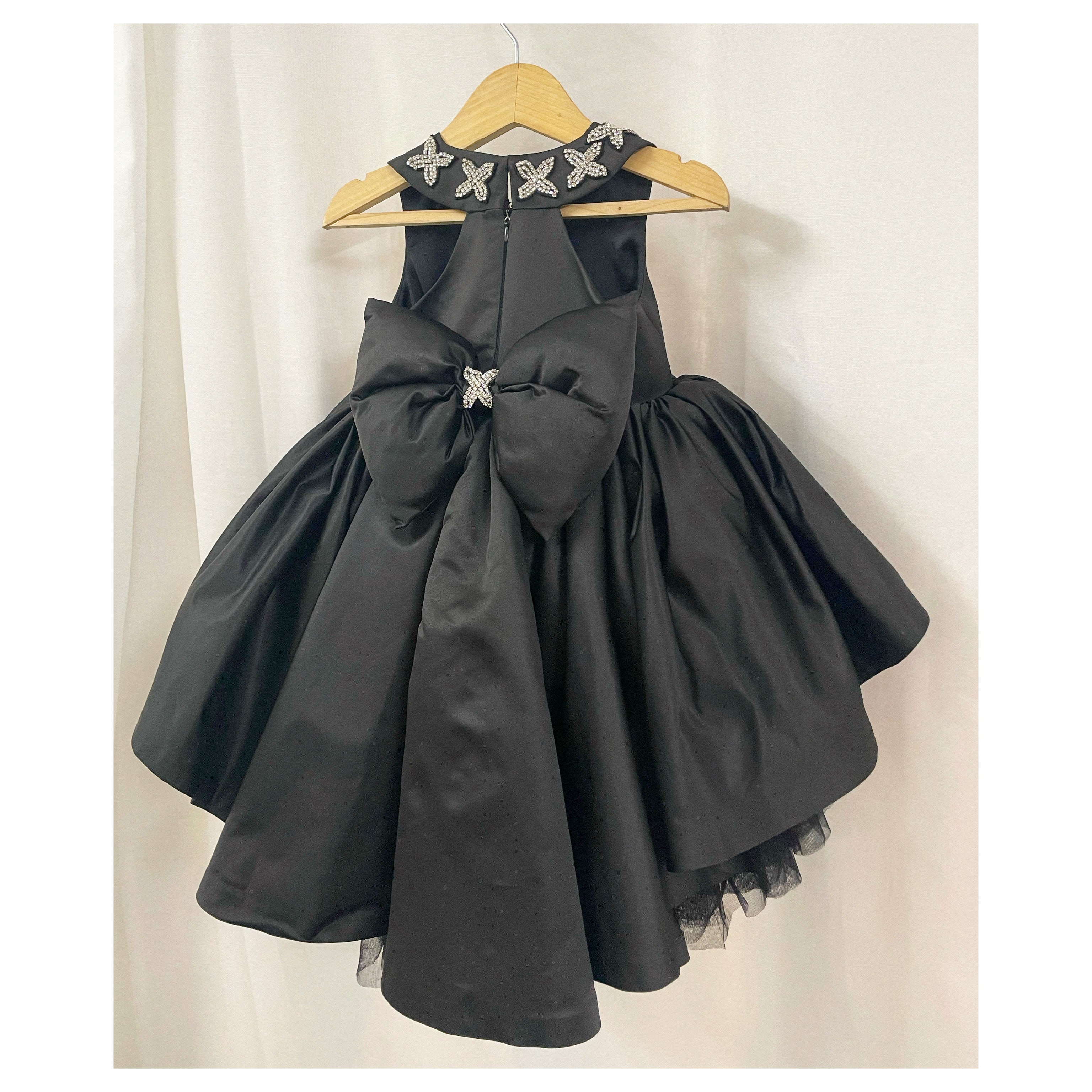 Luxurious satin hi- low style dress with embroidered crystal brooch details on the neckline.