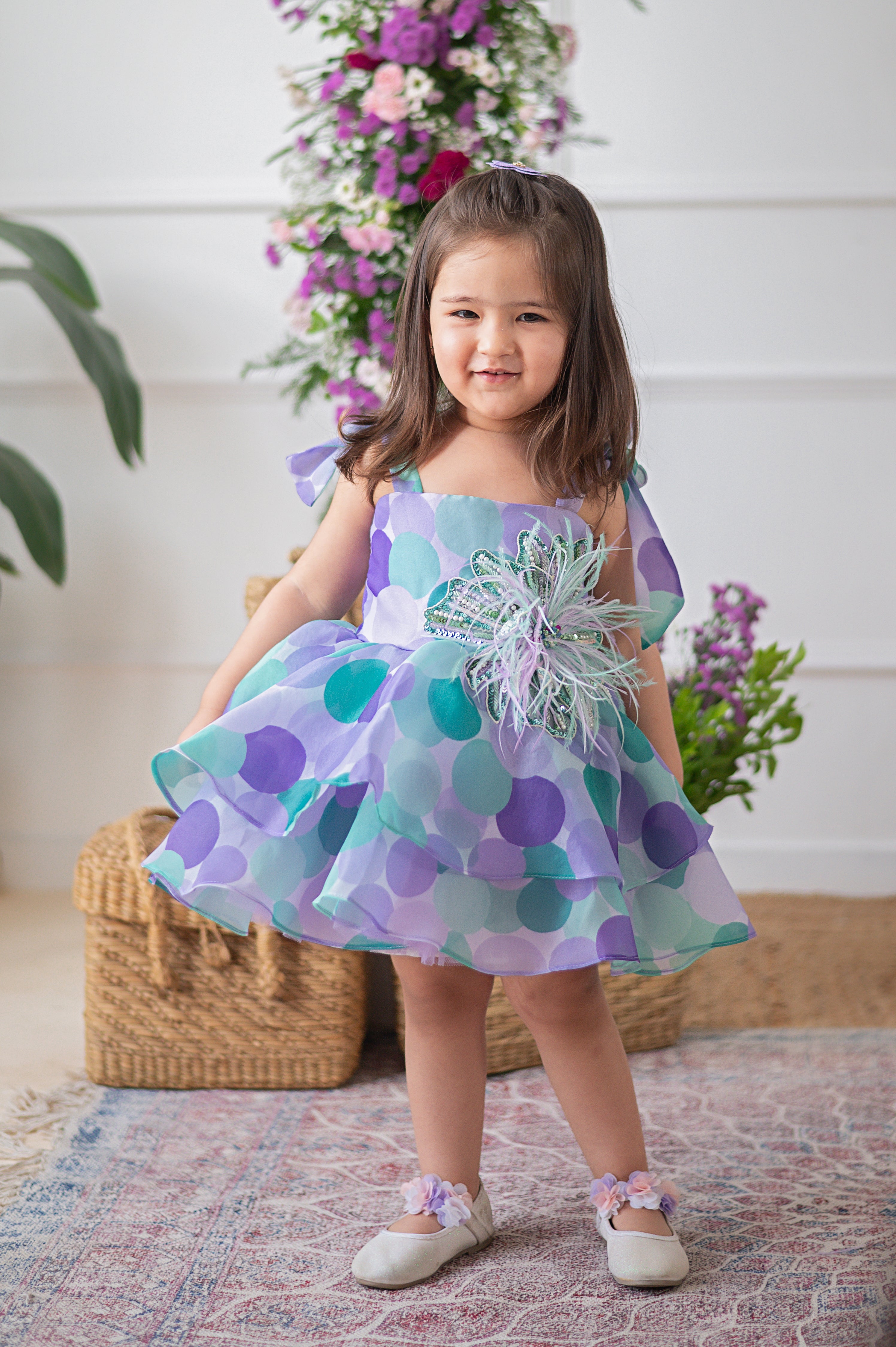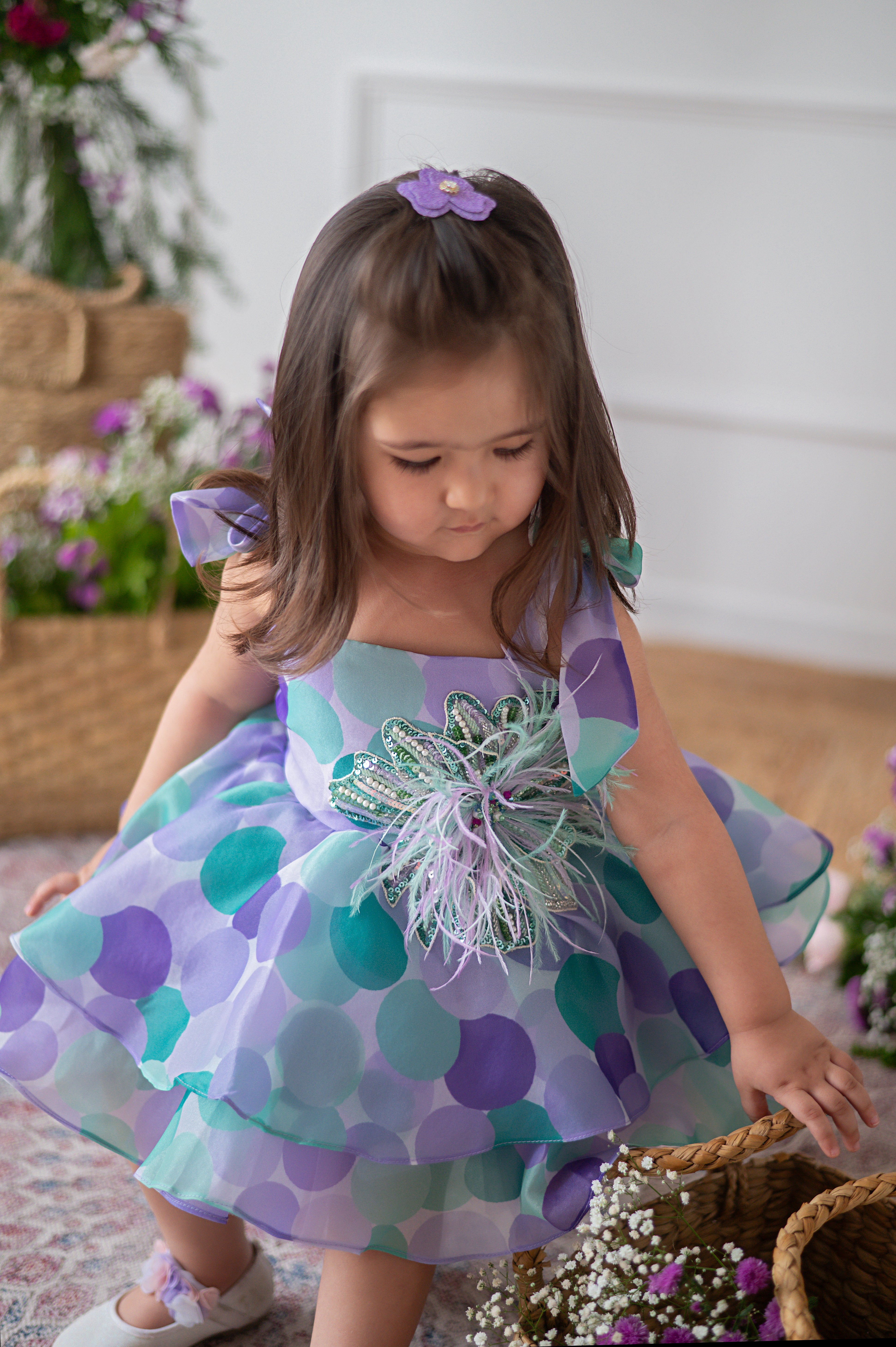 The dipped in polka dress is a pure organza custom printed dress with a gorgeous hand embroidered motif with feathers.