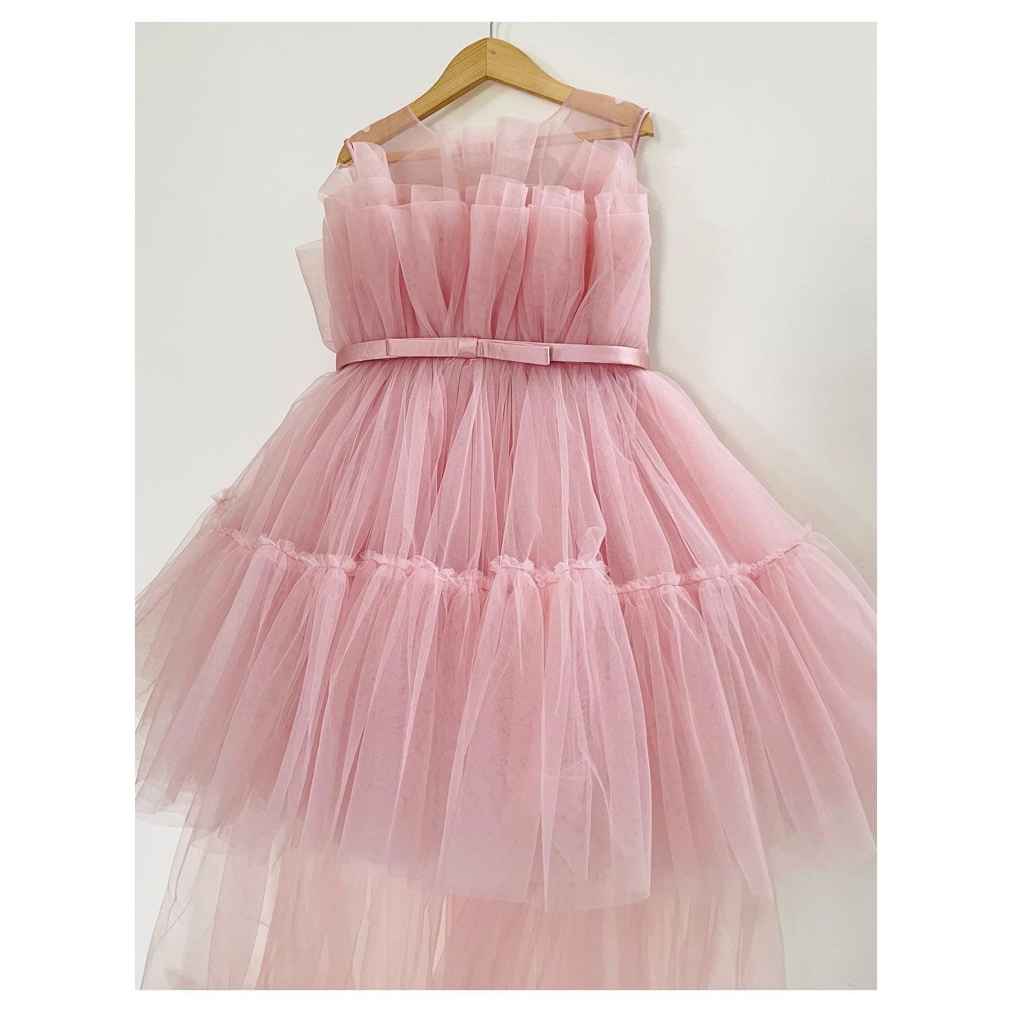 Tulle frills dress with a long trail at the back.