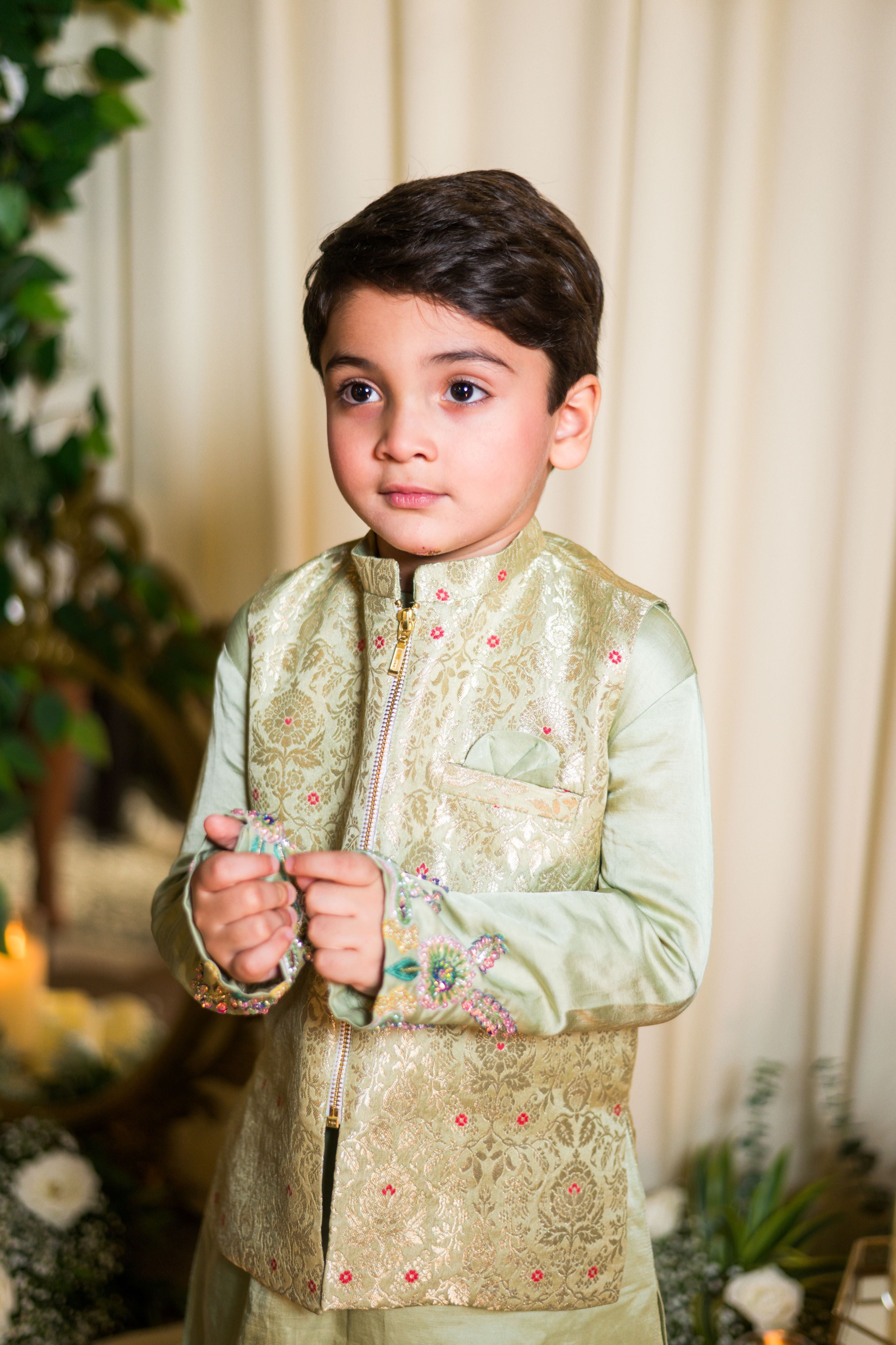 A gorgeous green linen satin kurta with hand embroidered sleeves paired with a pure silk banarsi bandi jacket and cotton silk pant.