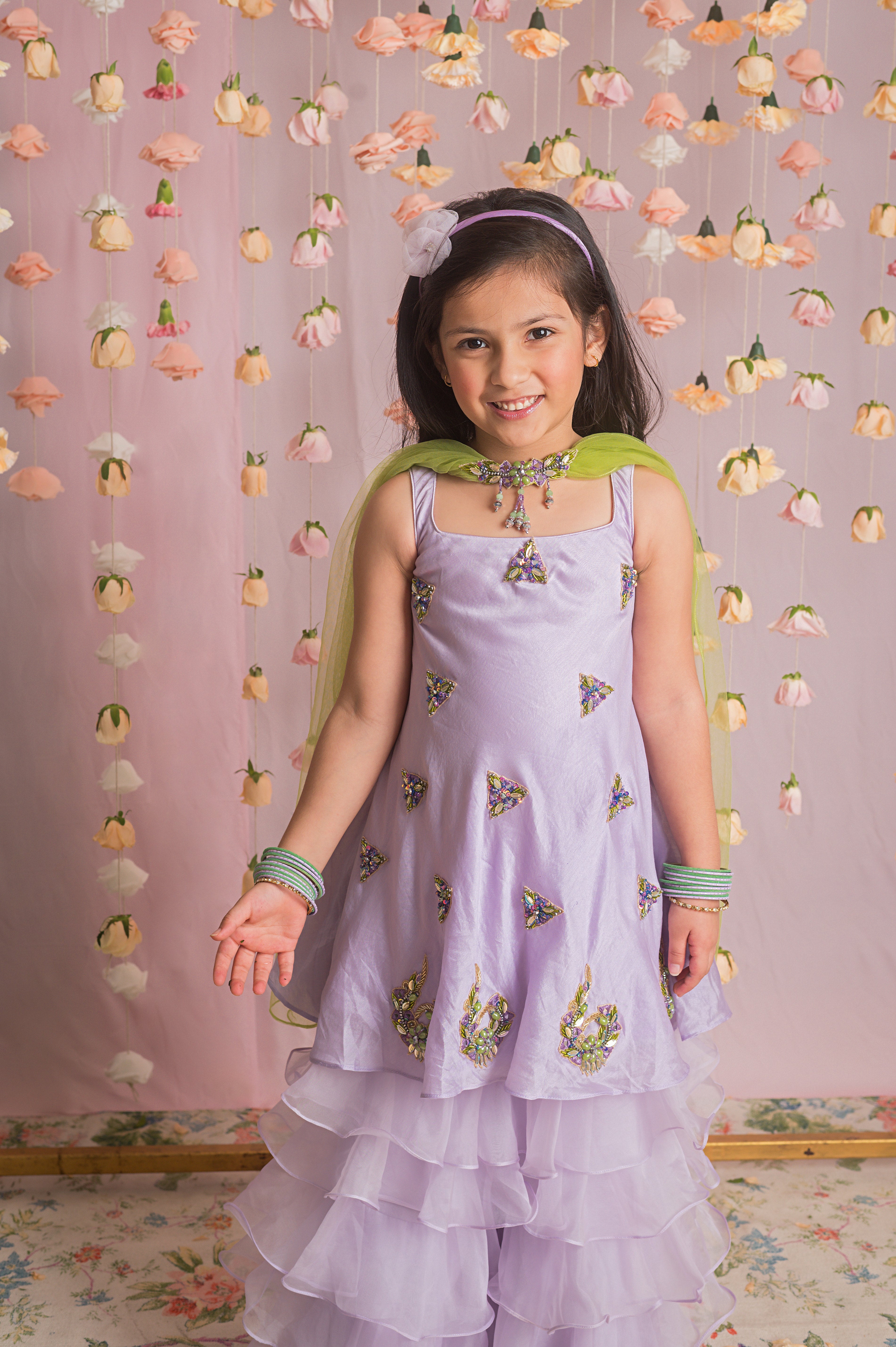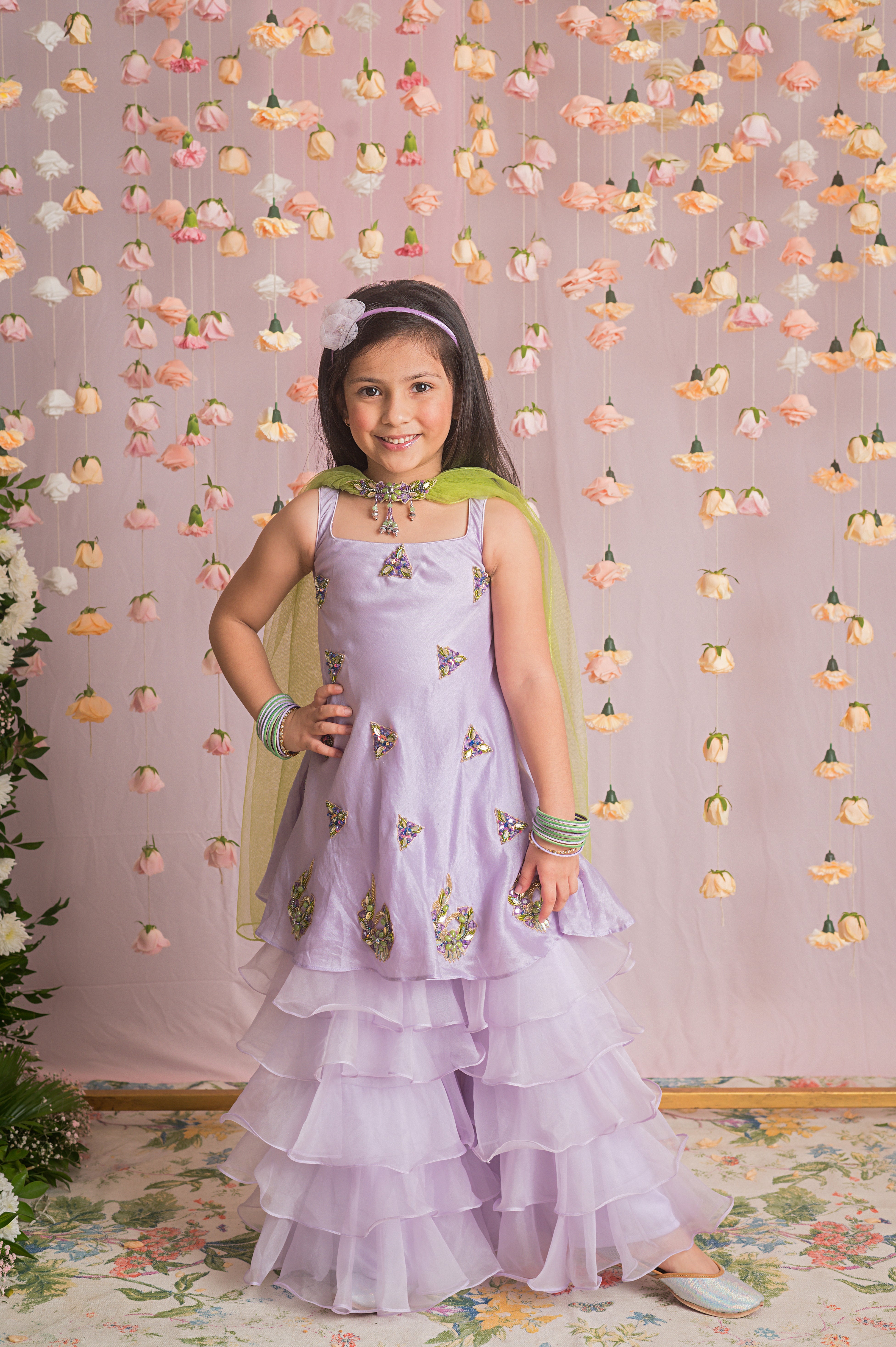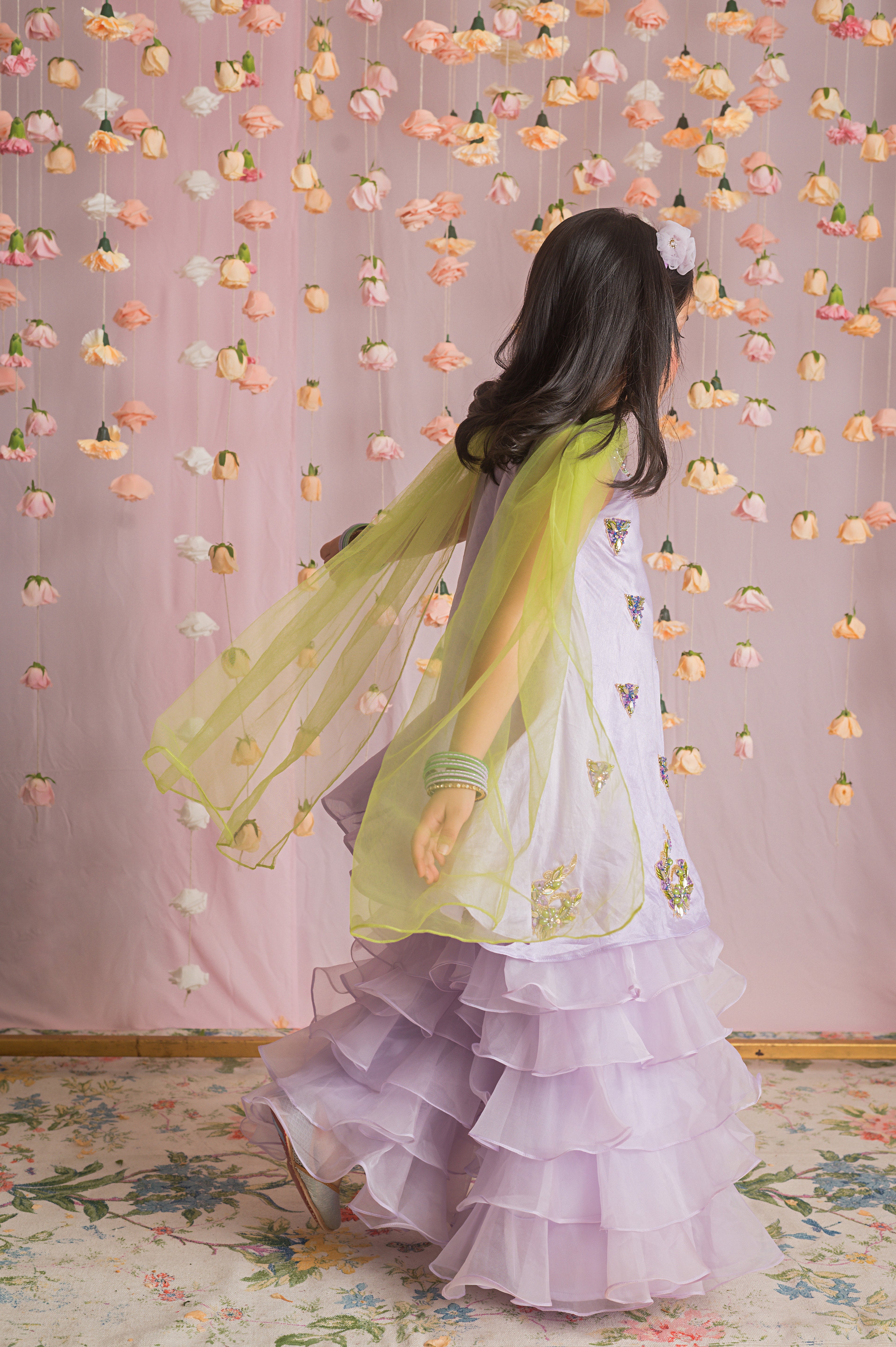 Embroidered Chanderi kurti paired with a layered organza palazzo and a neon green dupatta with a choker attached.