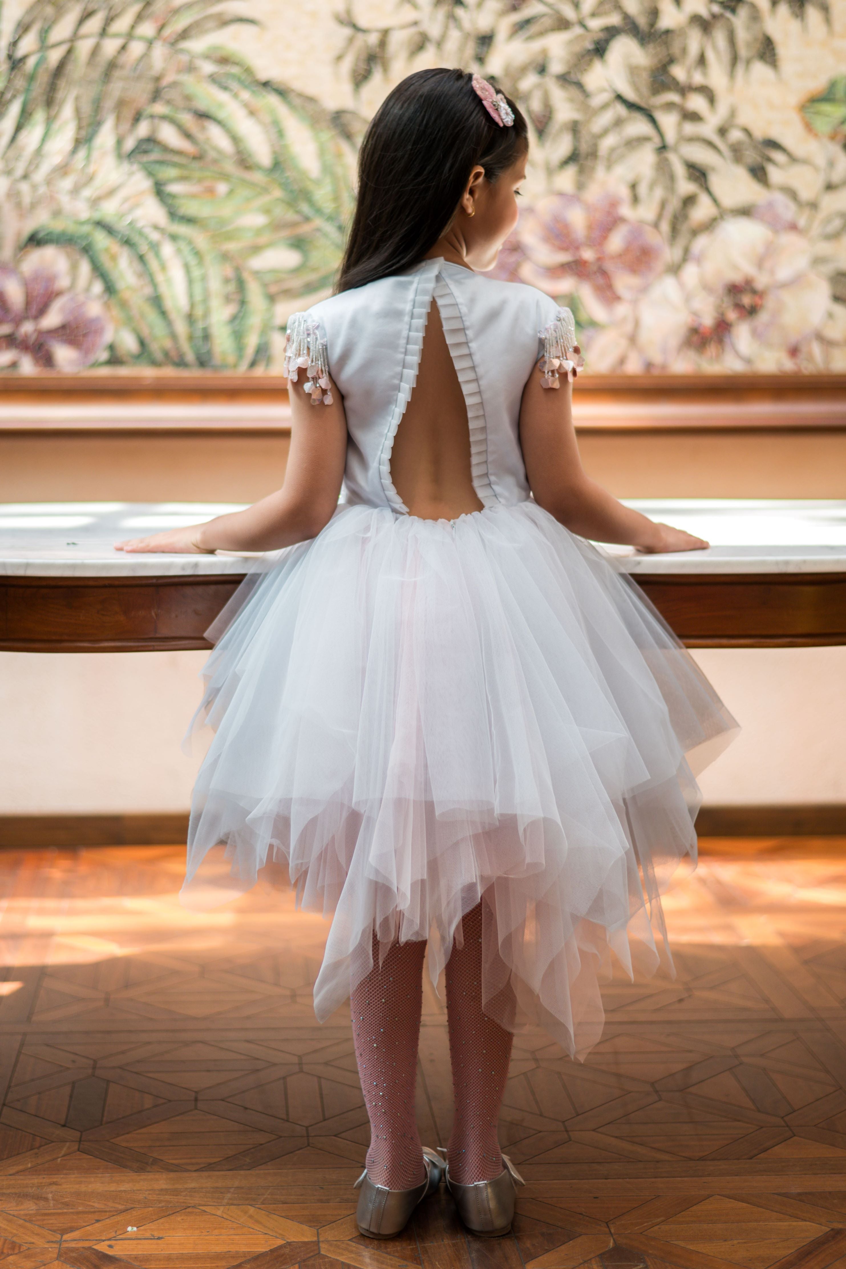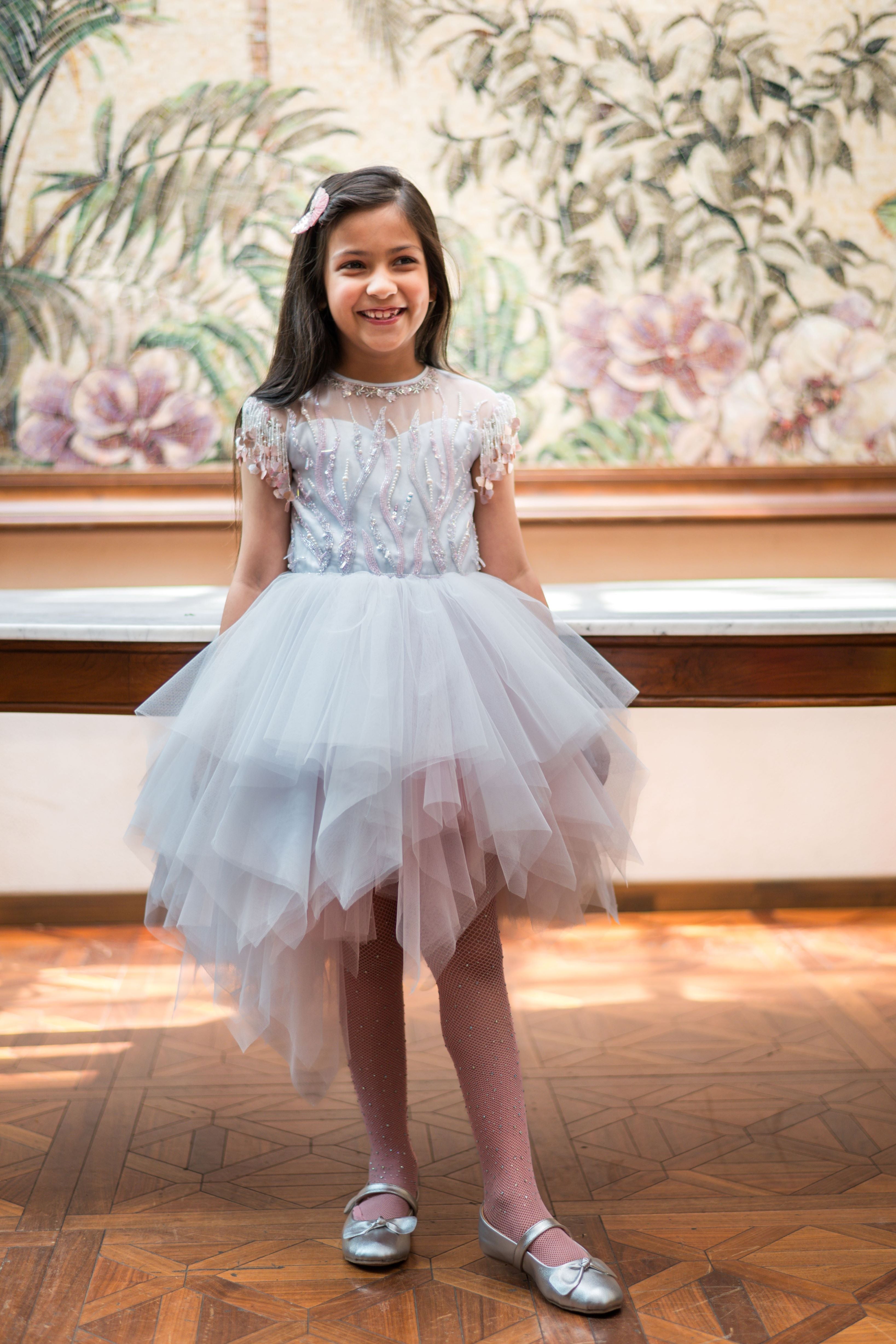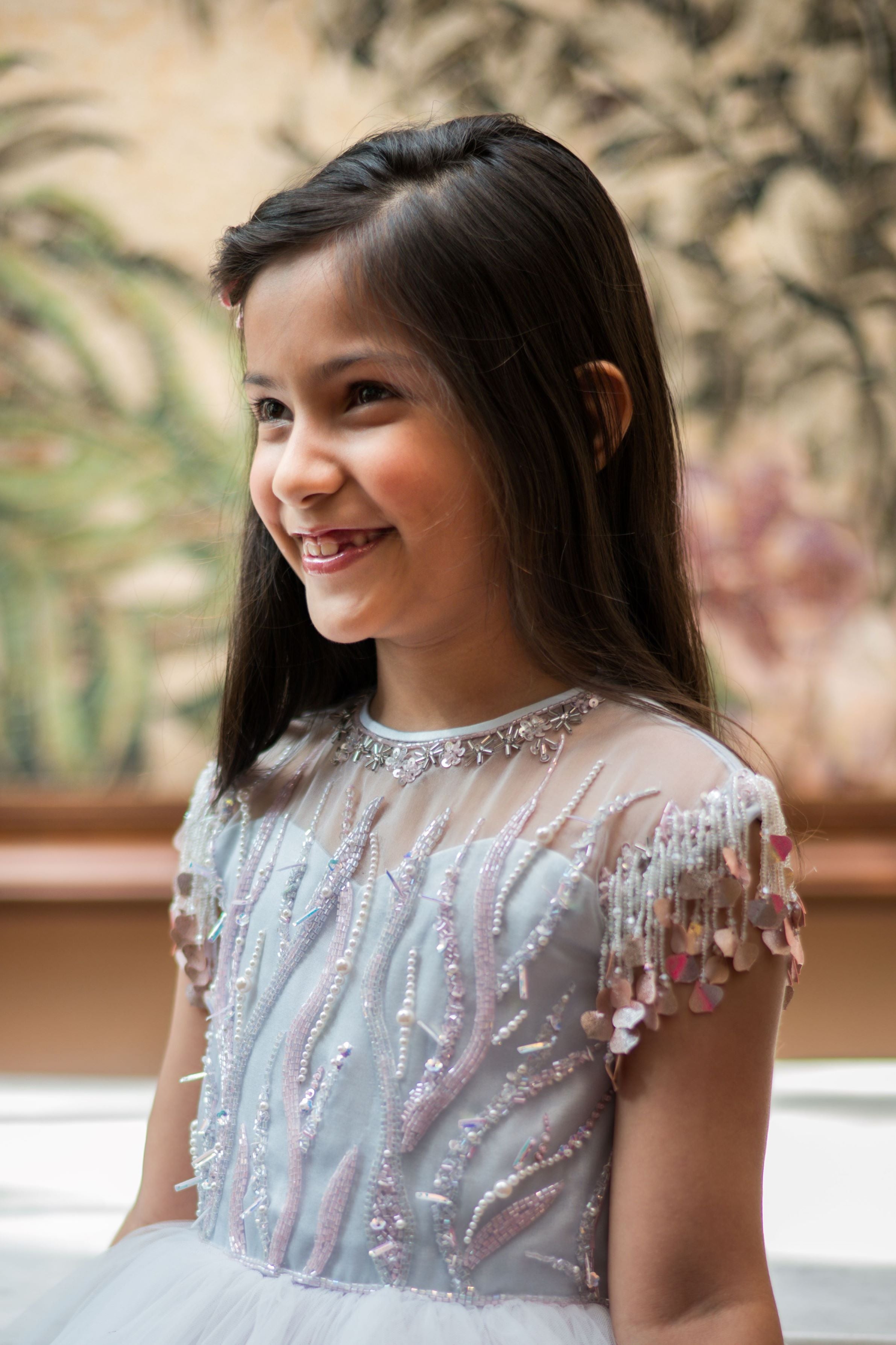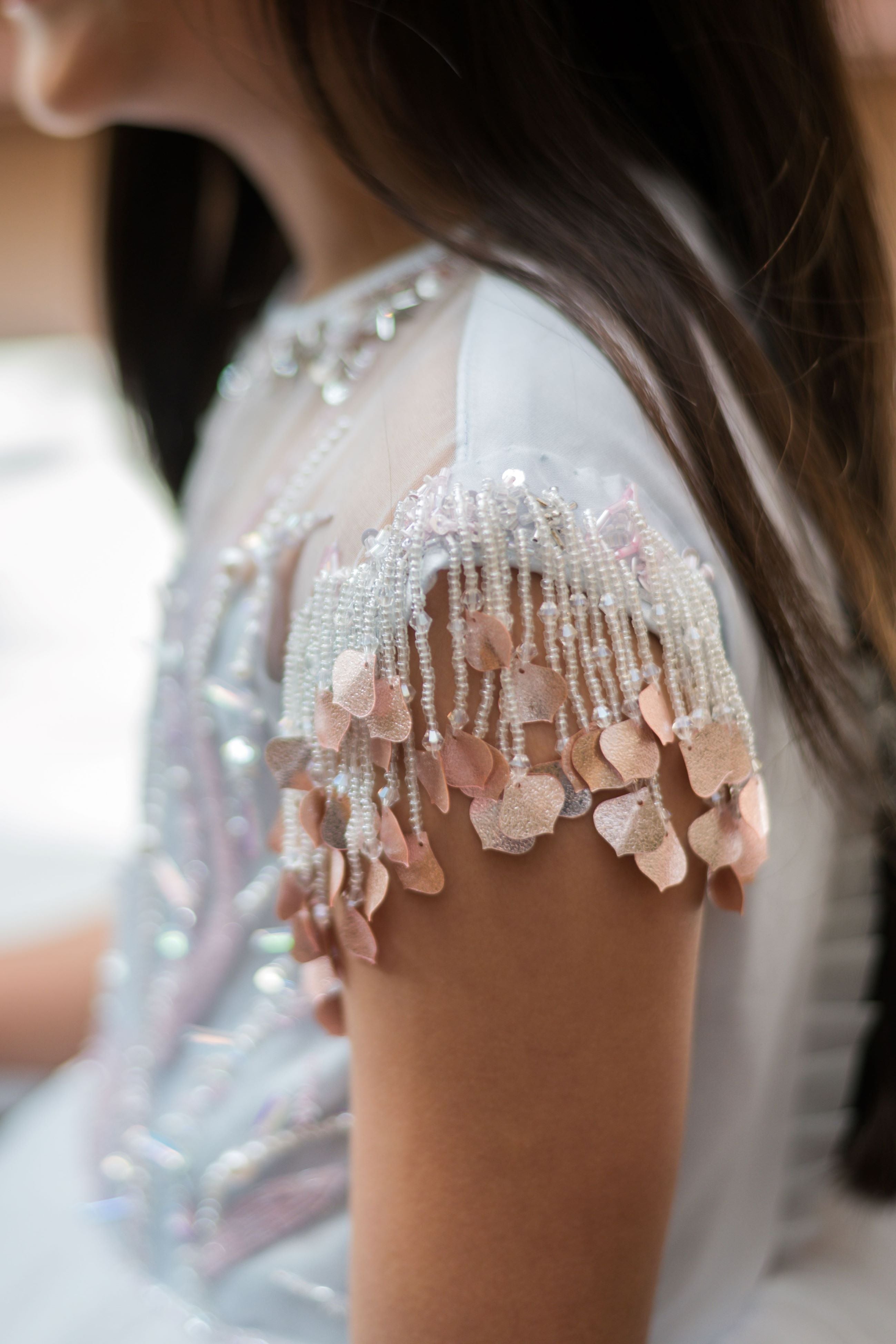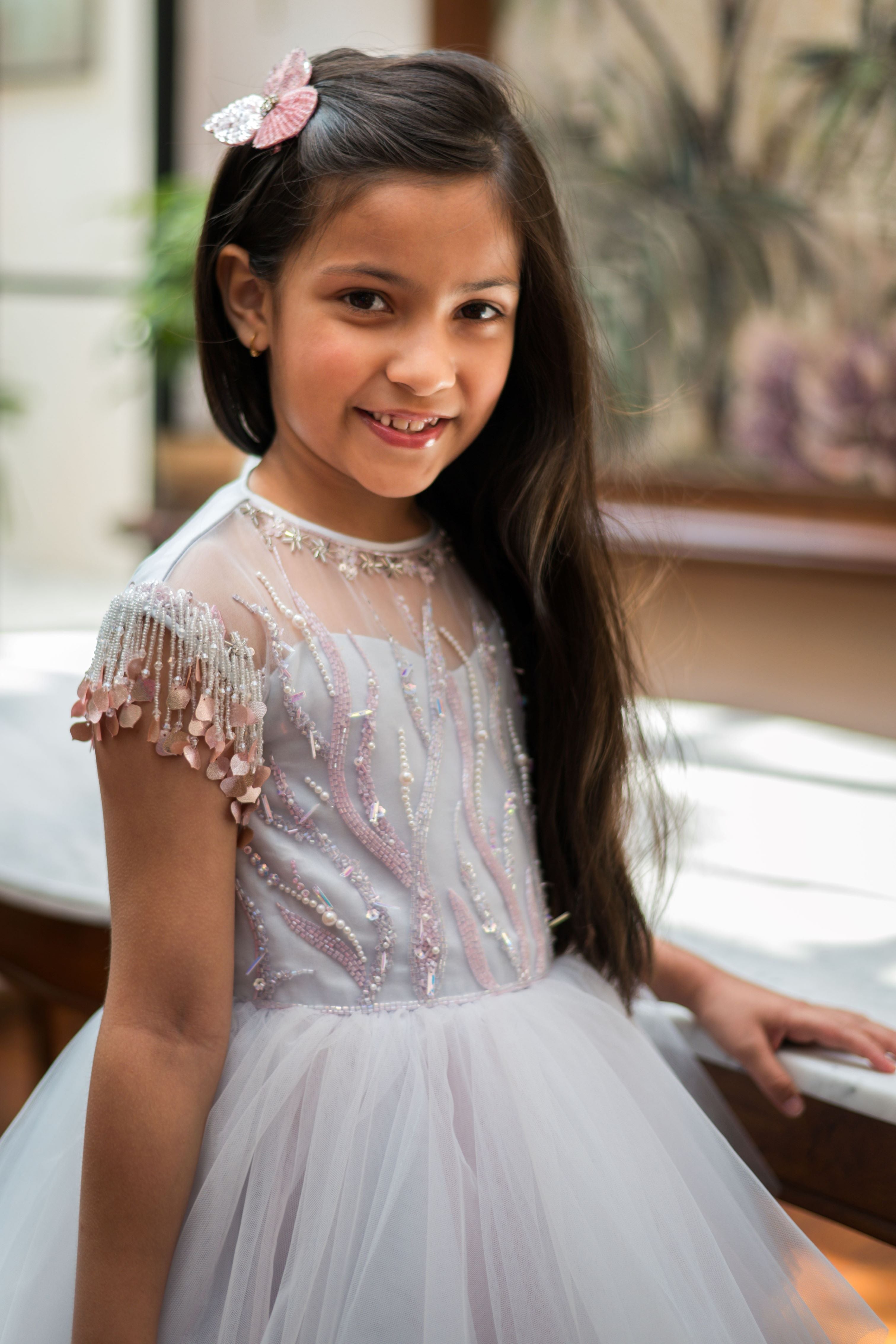 An organza bodice dress with crystals embroidery on the bodice & absolutely beautiful dangling tassels on the sleeves. The dress is in a soft blue and pink color combination.