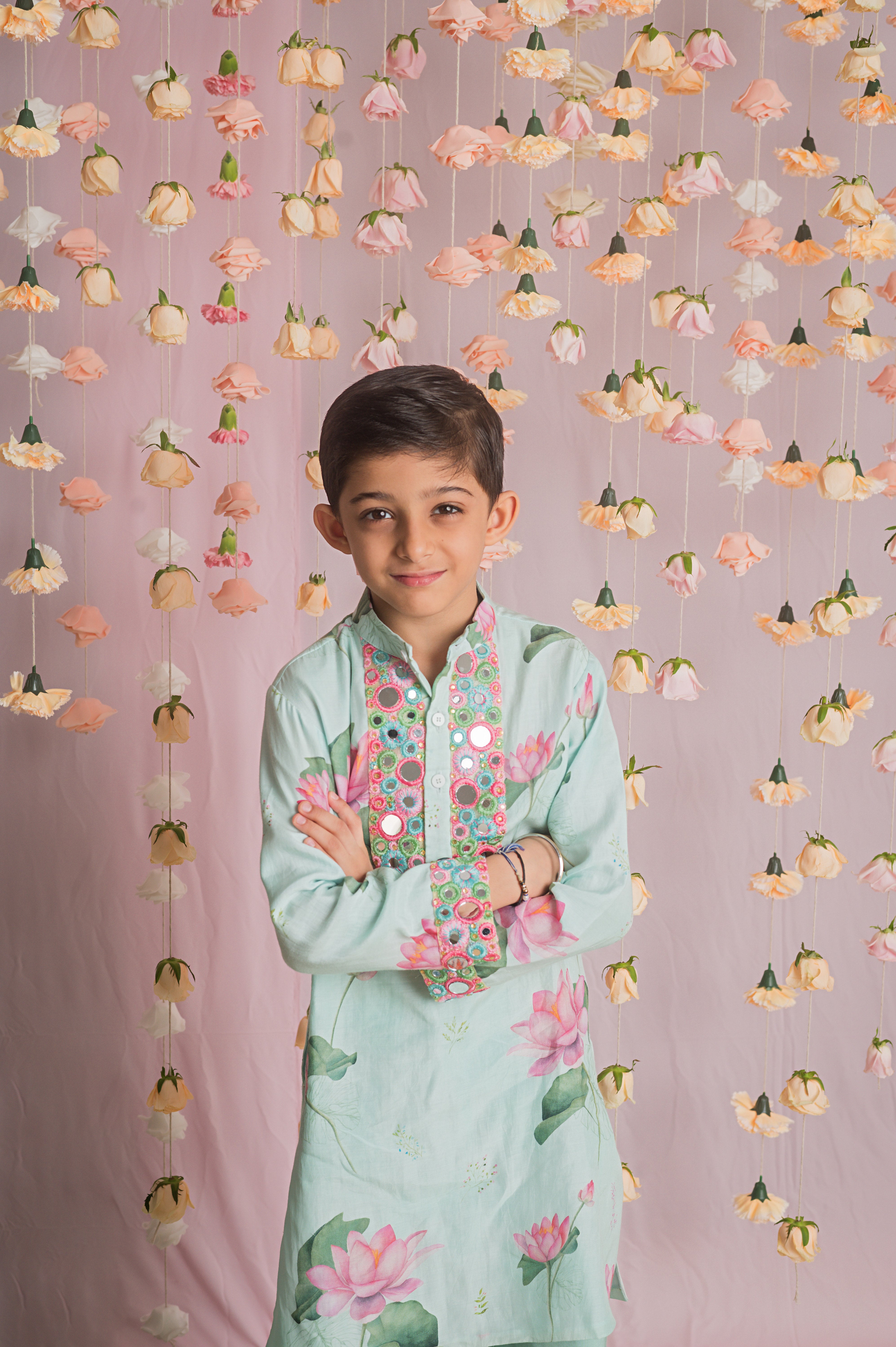 Lotus print kurta paired with a cotton silk pant, with mirror work details.