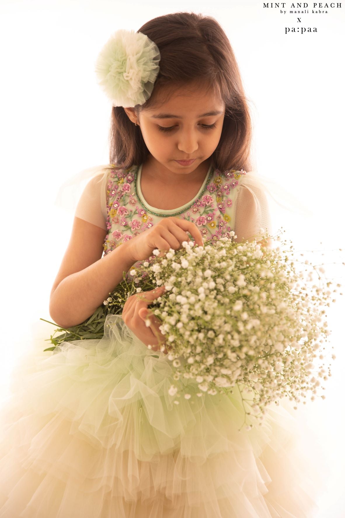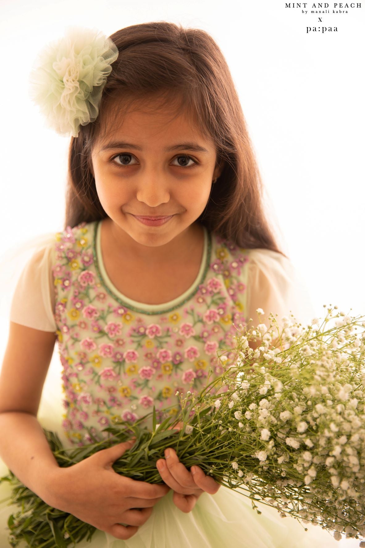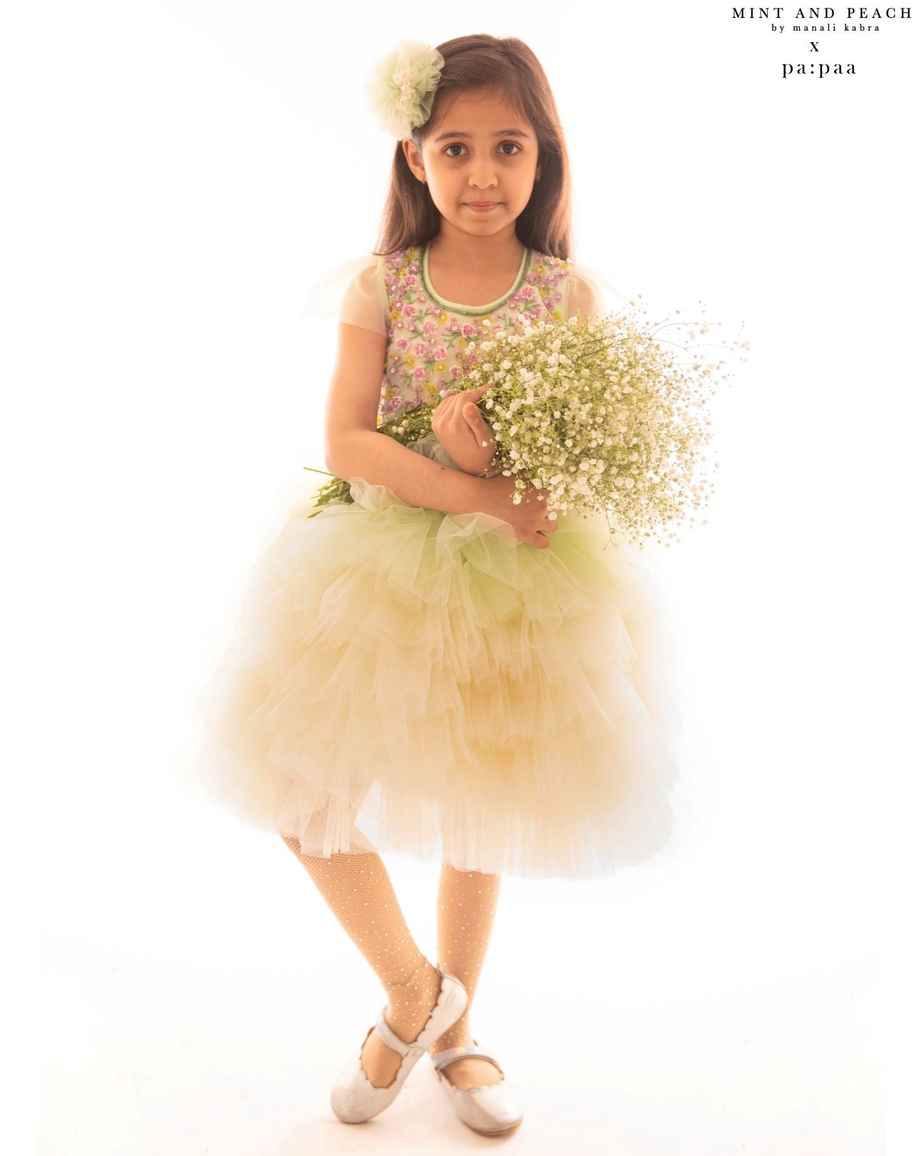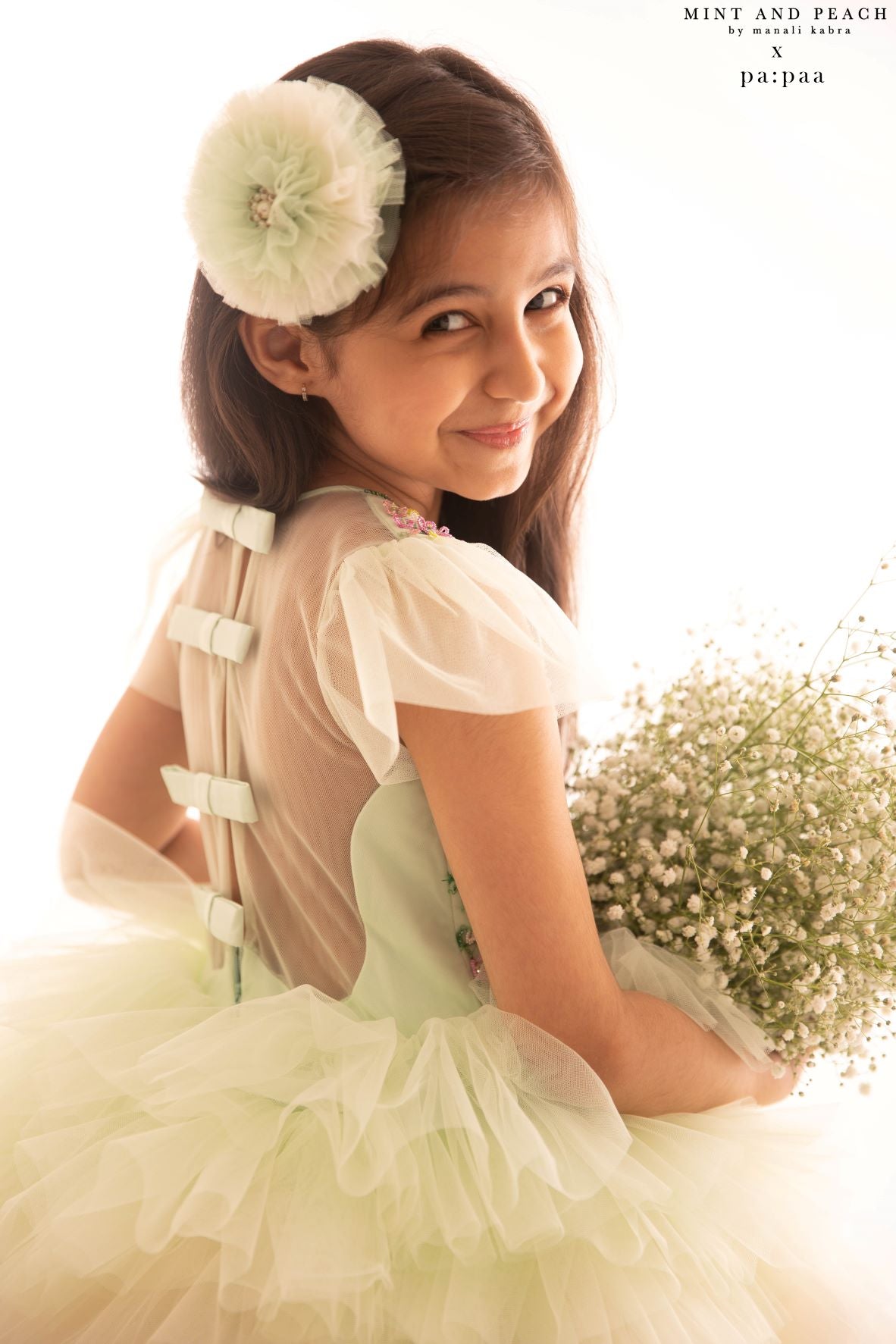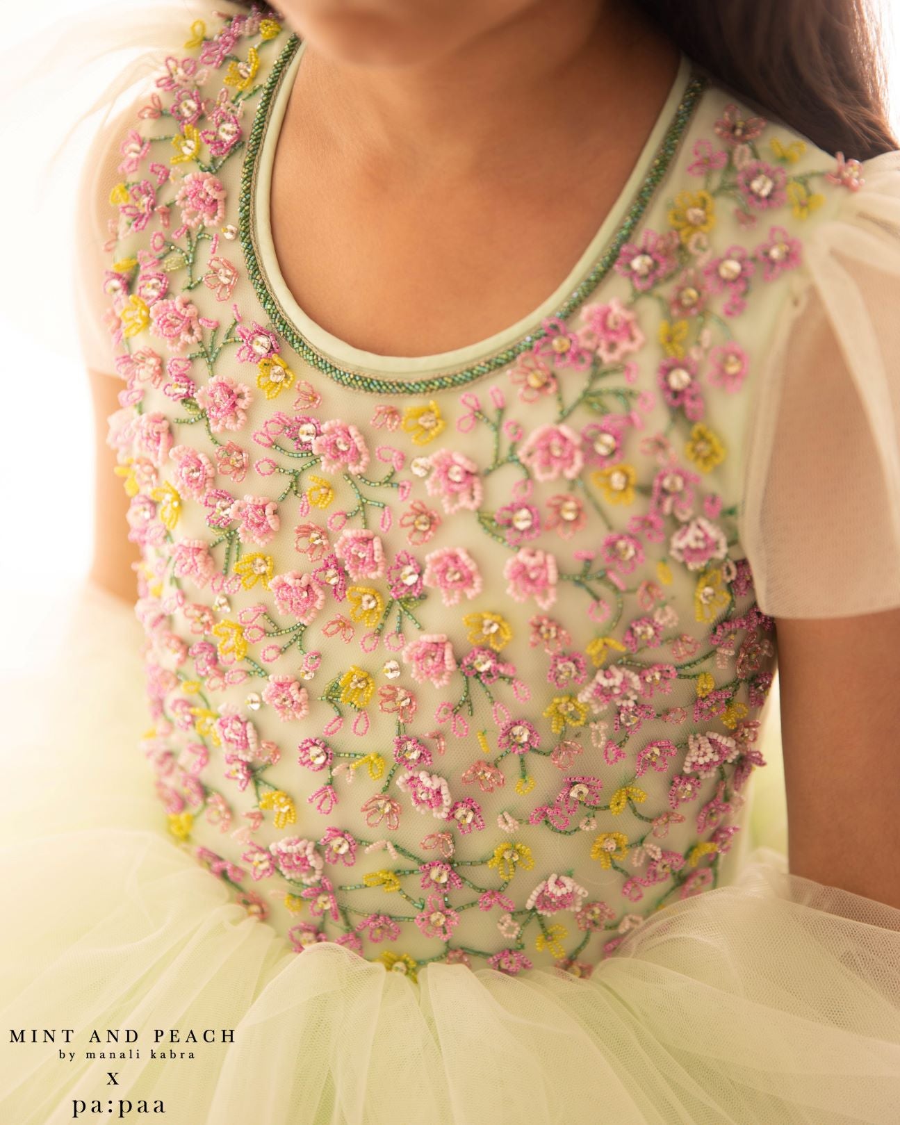 Luxurious embroidered bodice with ombre tulle flare. sheer back and bow details.