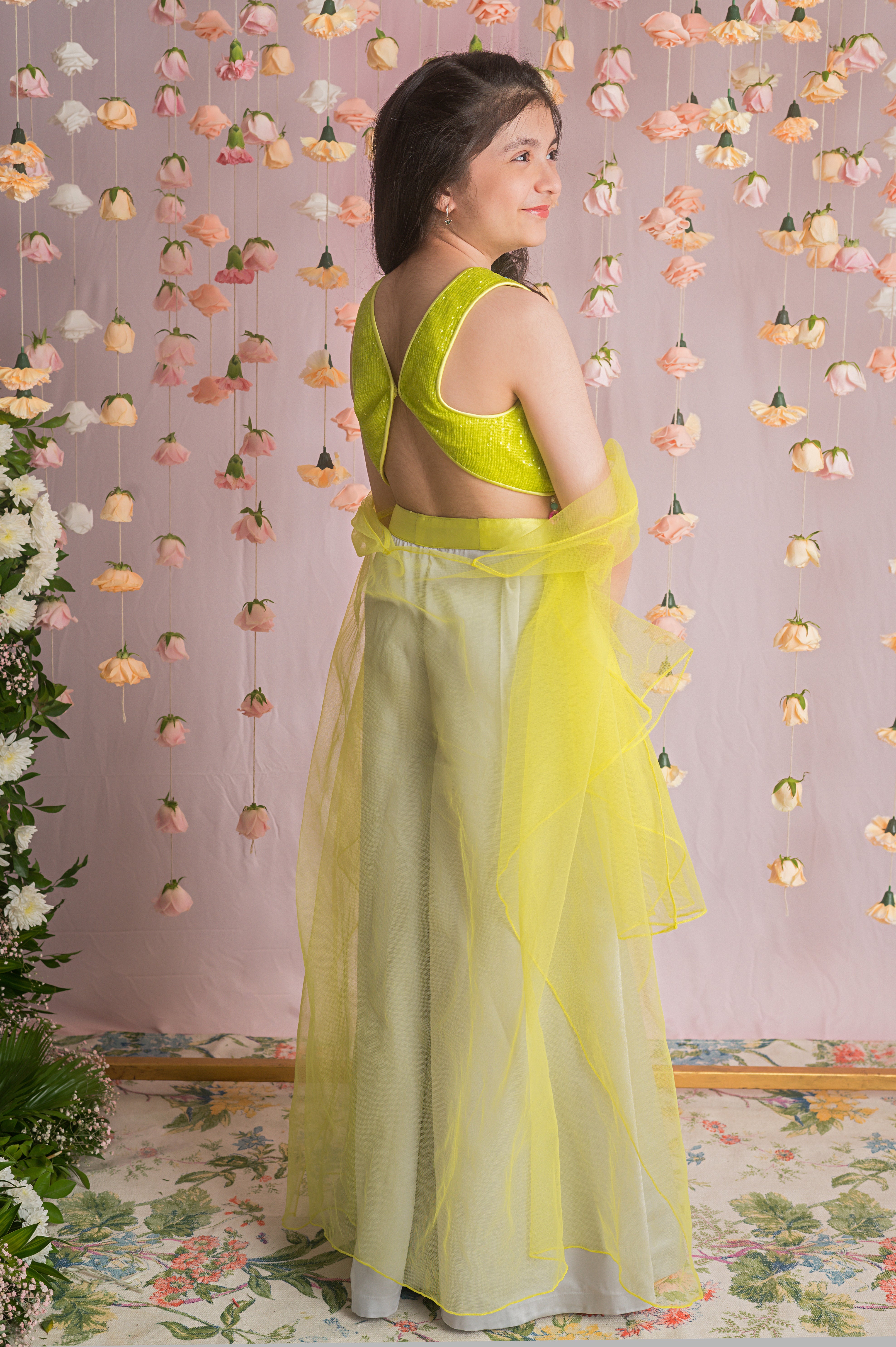 Neon embroidered sequins crop top paired with a milano satin palazzo pants. Comes with a tulle cape.