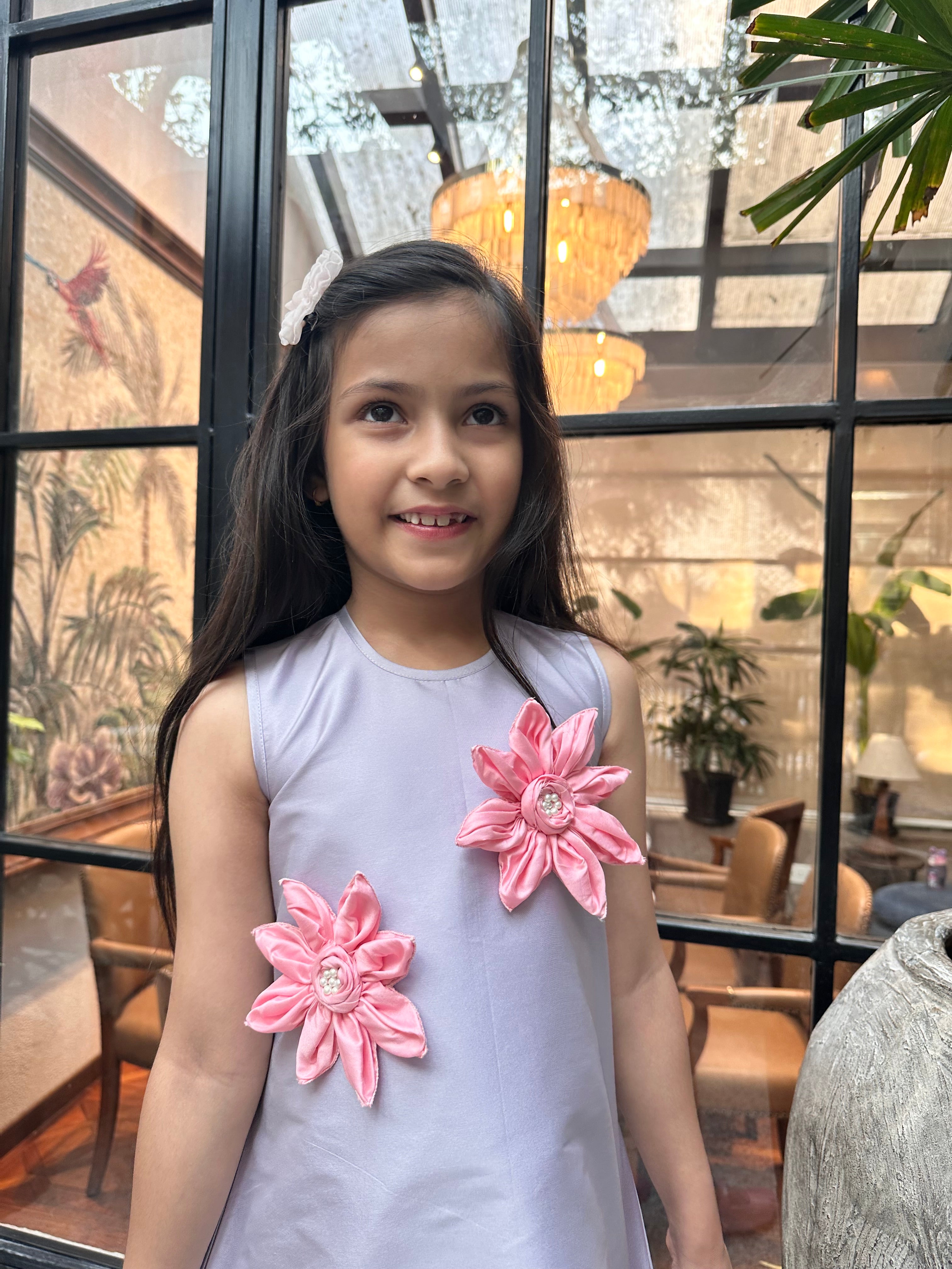 Lavender shift dress with pink contrast handmade flowers