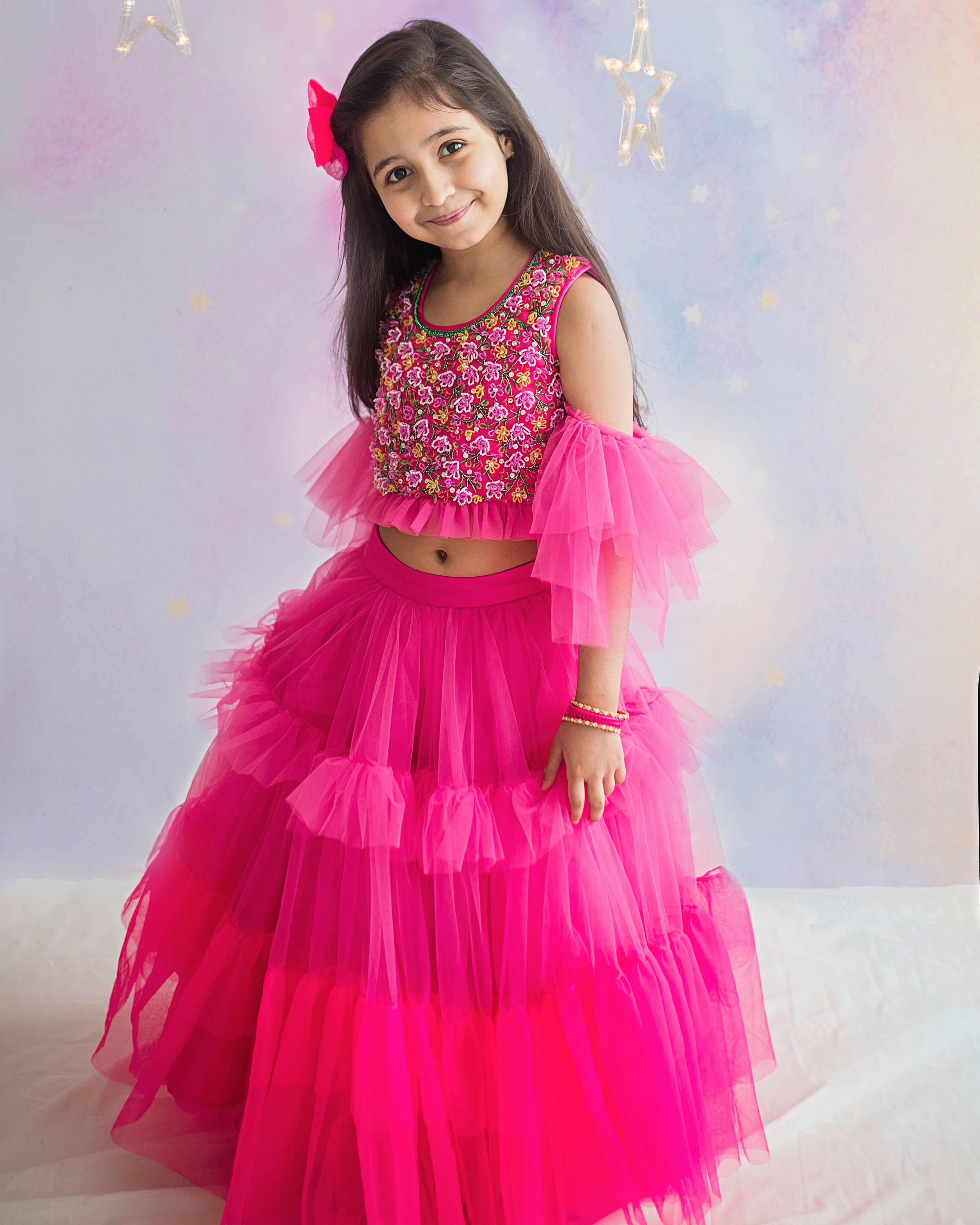 Embroidered choli with sheer back & elegant bows paired with two tone layered lehenga.