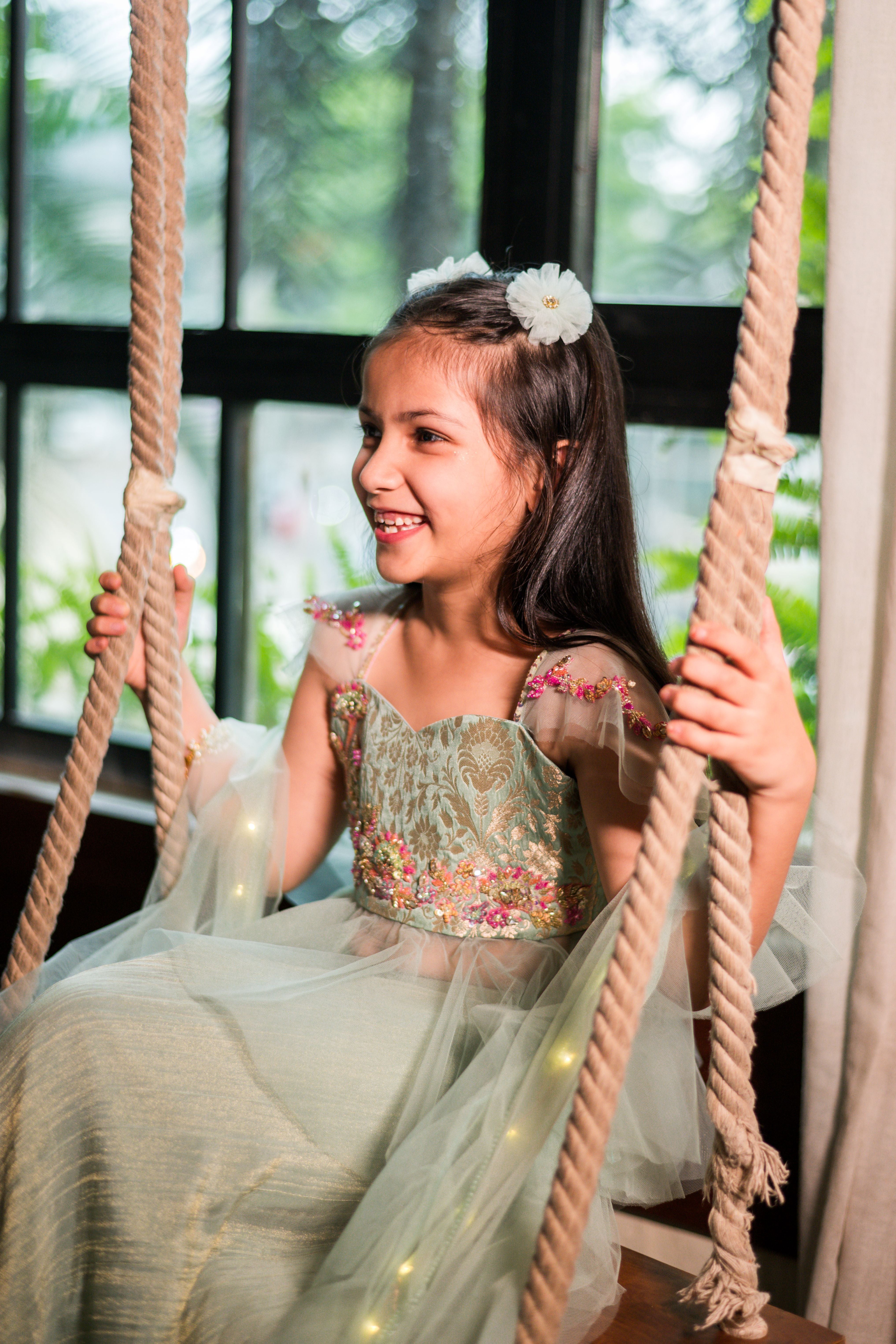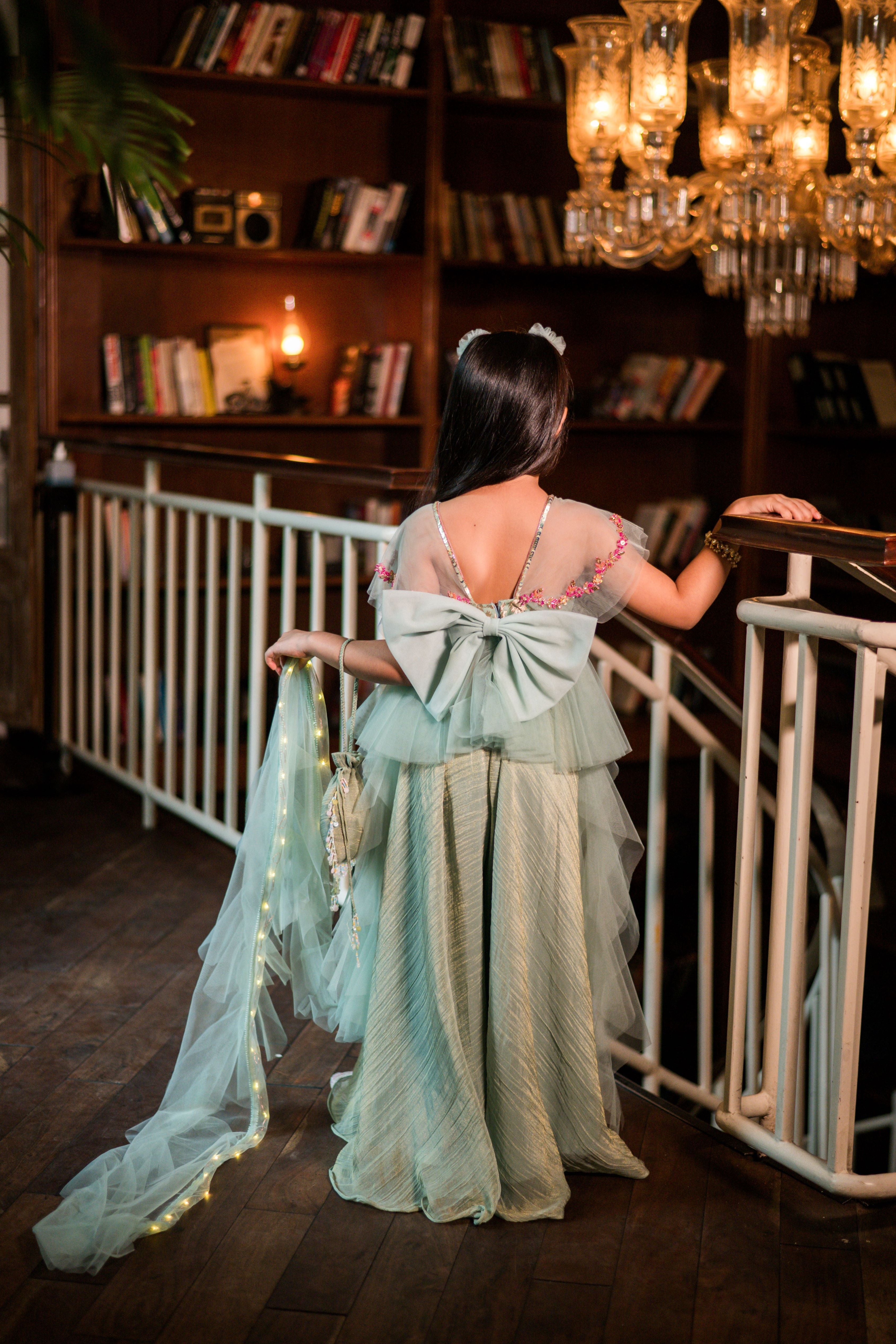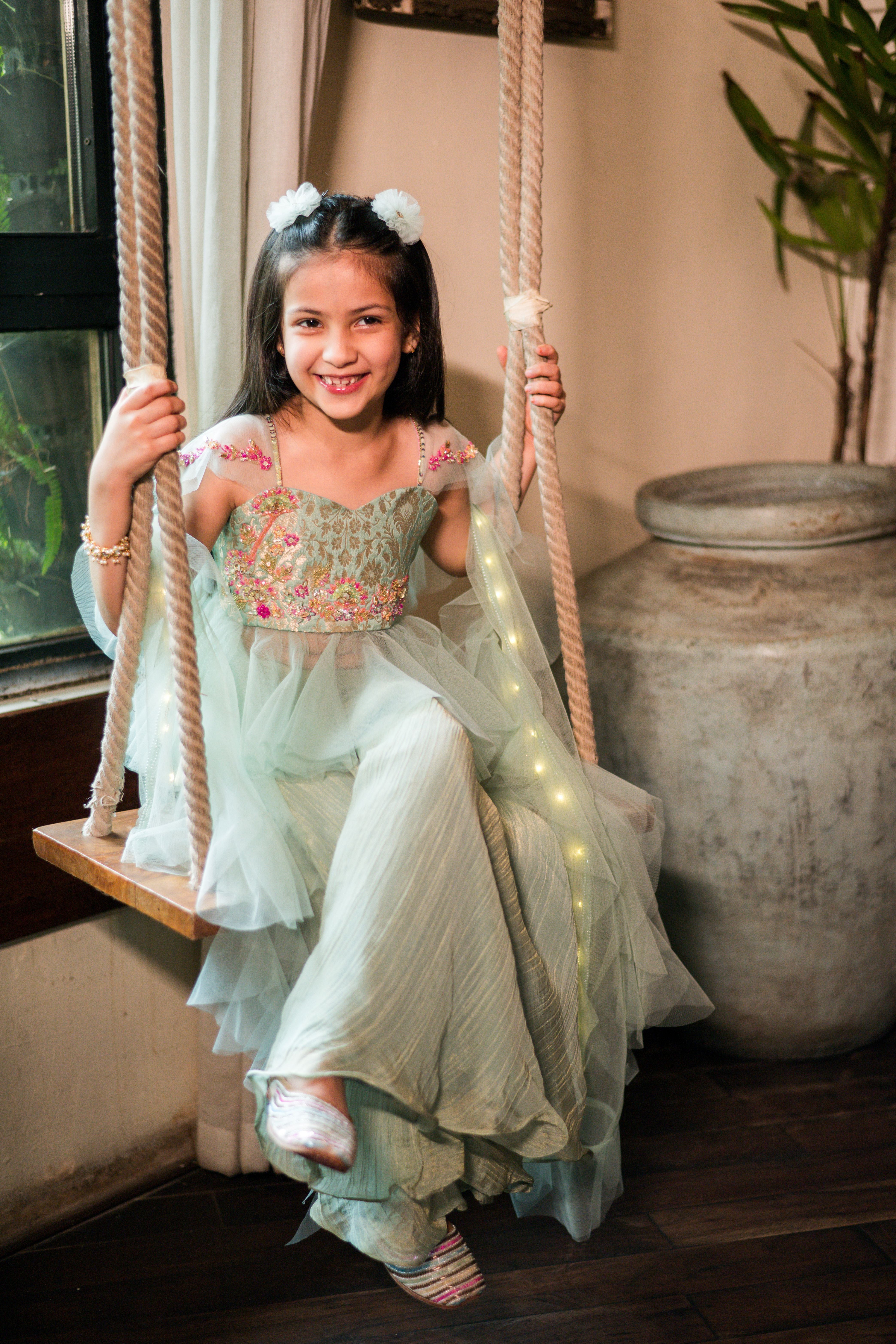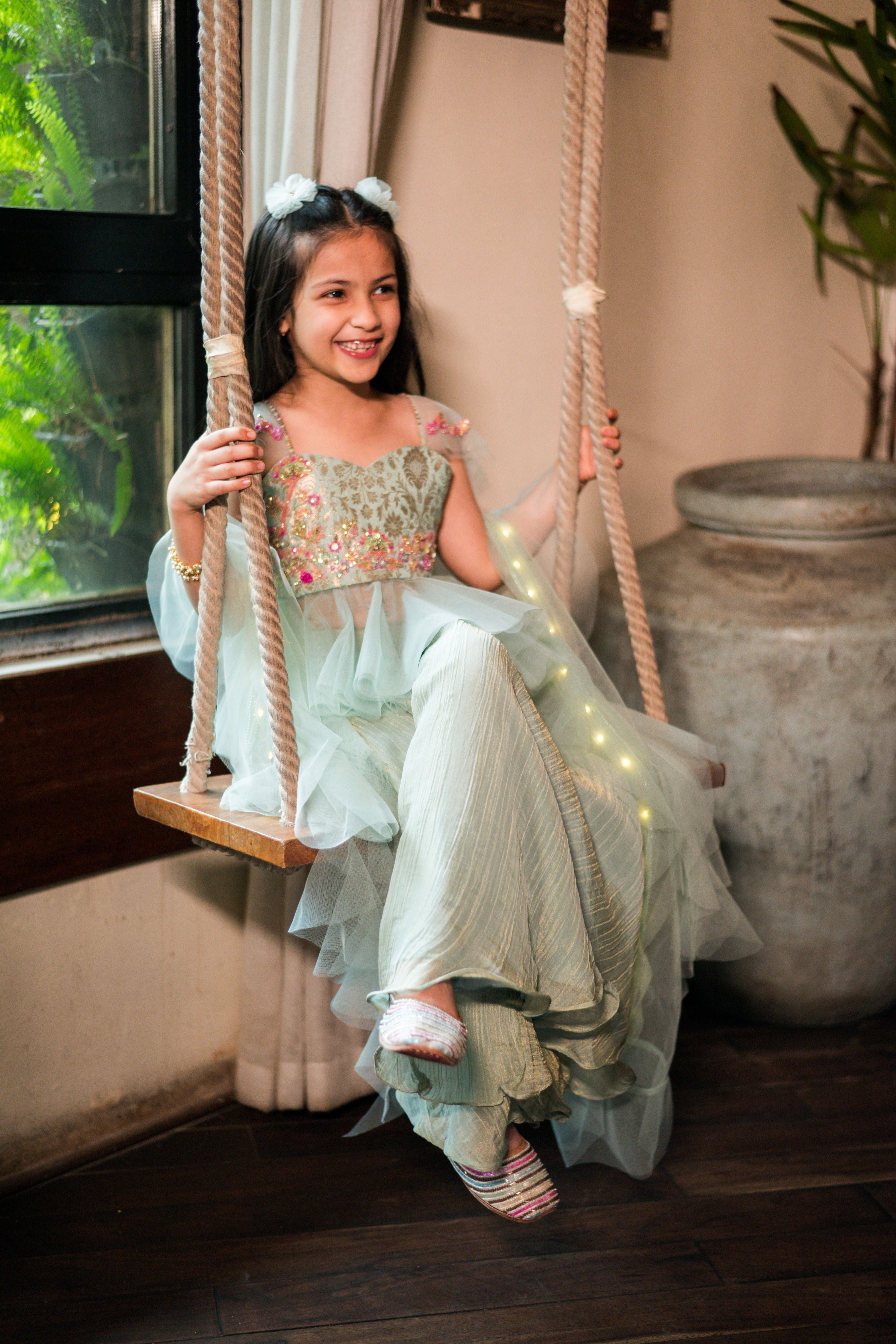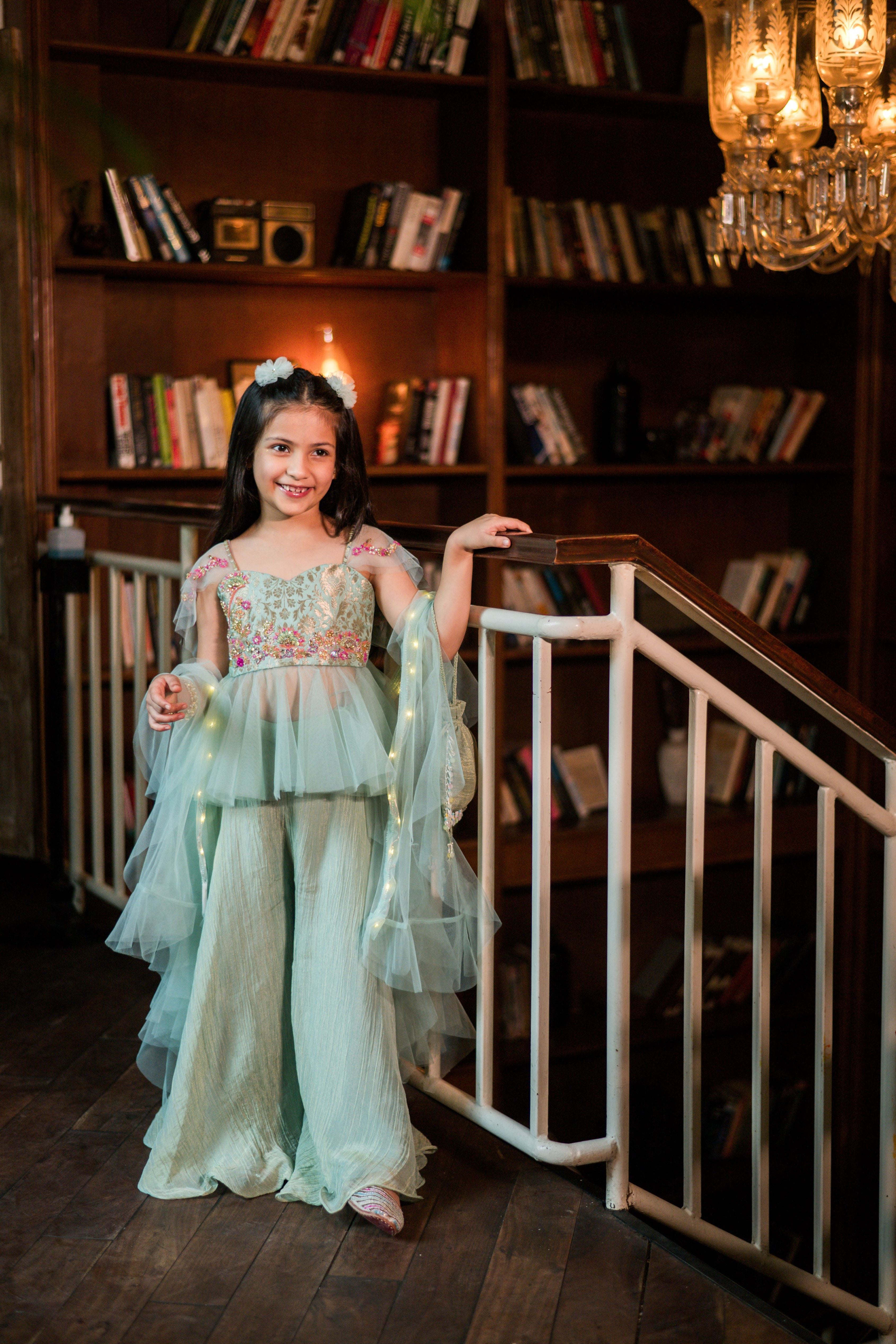 Stunning green brocade embroidered bodice with sheer tulle peplum layers. The back has an oversized bow. Paired with a crush tissue palazzo. The dupatta has fairy lights added to it.