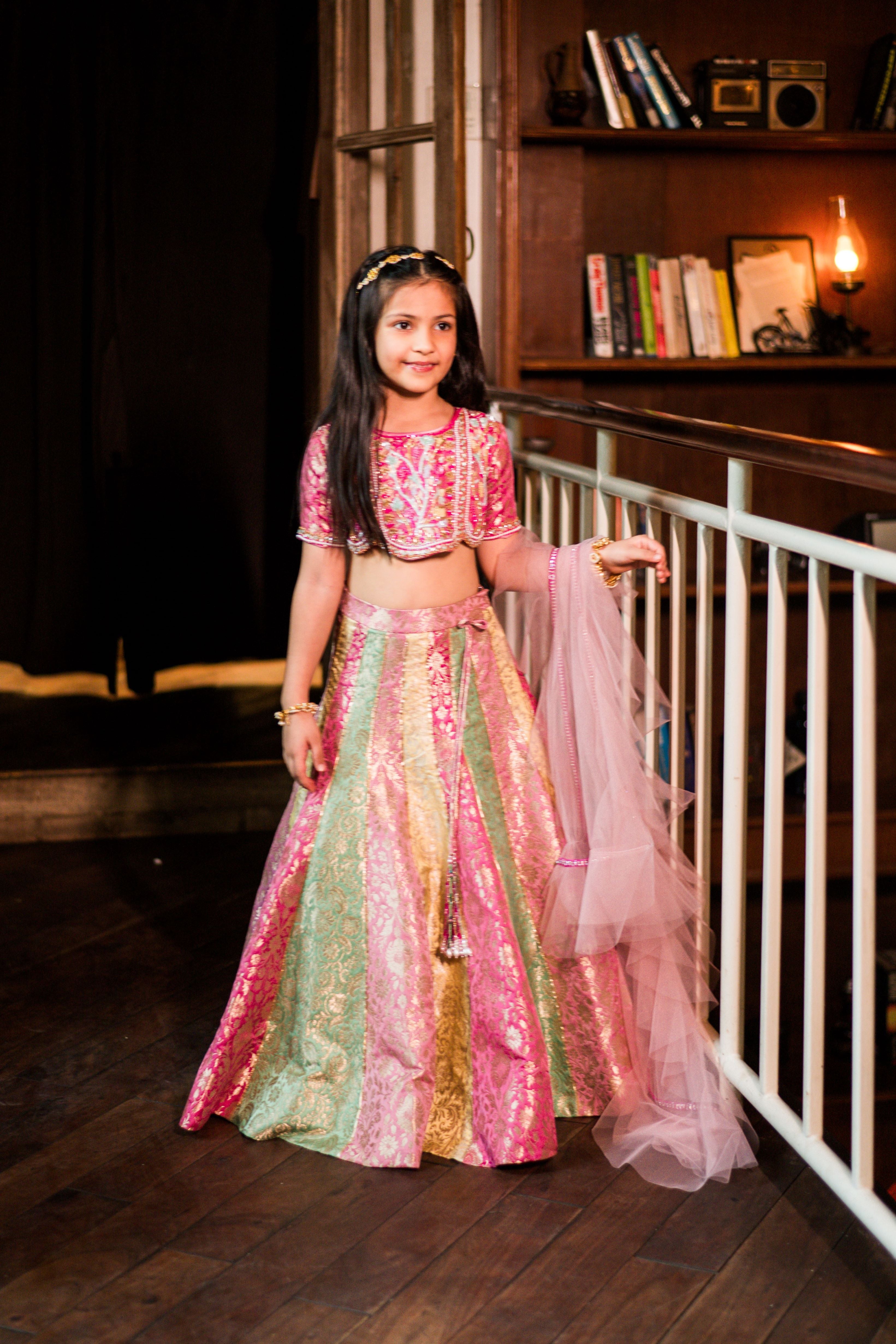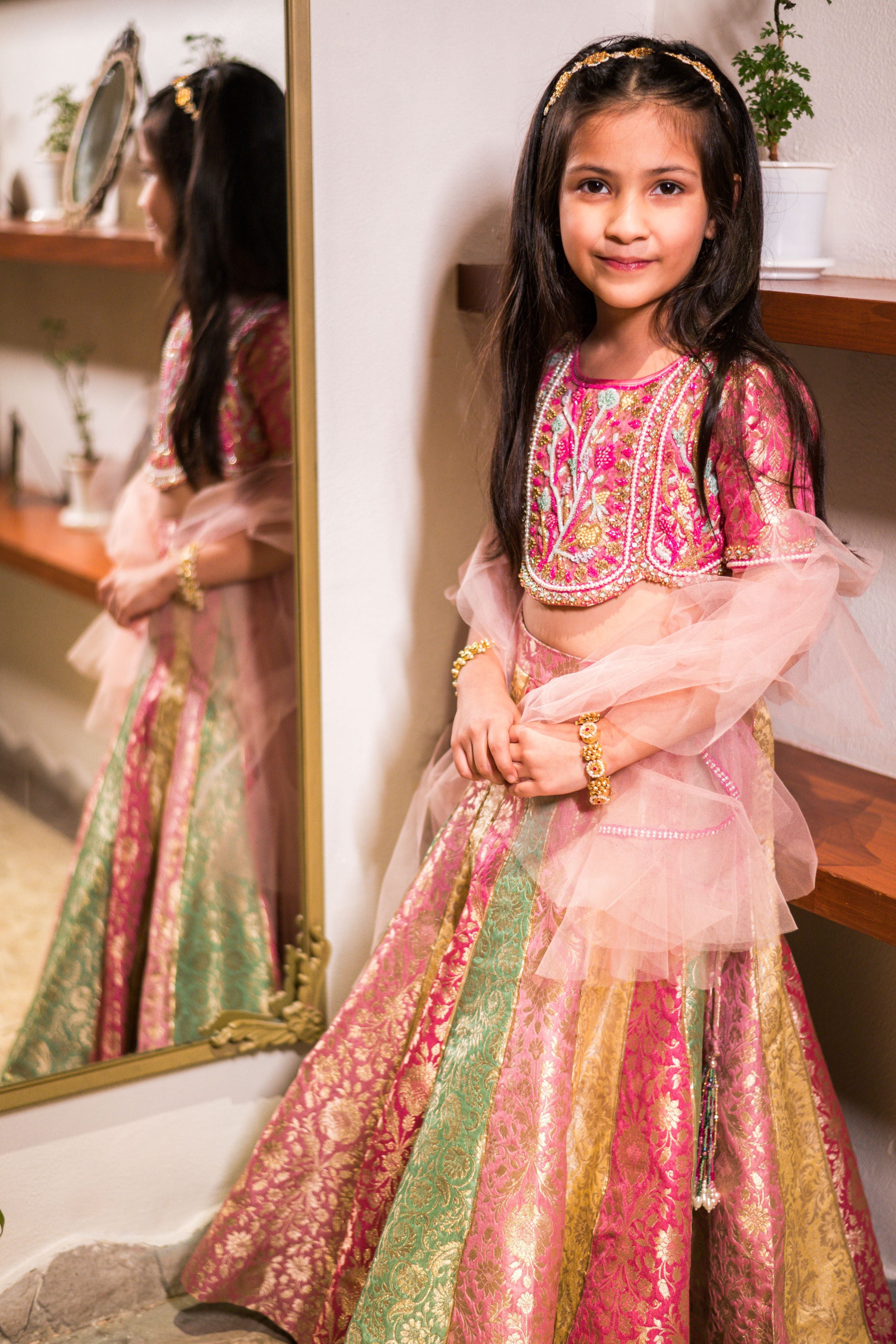 Luxurious colorful banarsi kalidaar lehenga in pure silk fabric paired with an exquisite hand embroidered choli with sheer back details. Comes with a dupatta with lace trimmings.