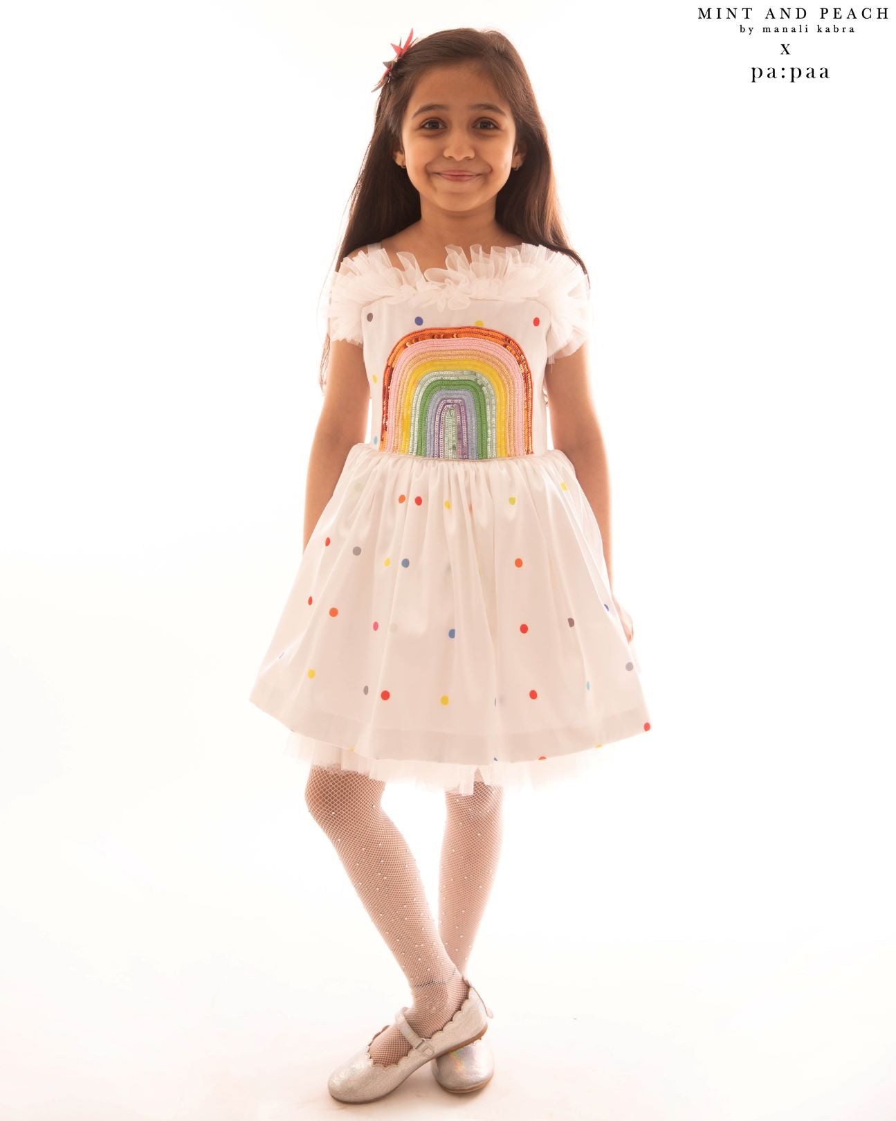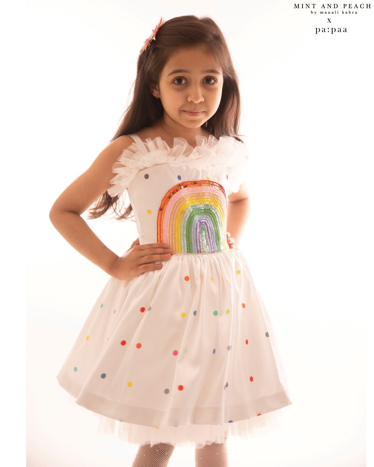 Luxurious satin colorful polka printed dress with a hand embroidered rainbow on the bodice.