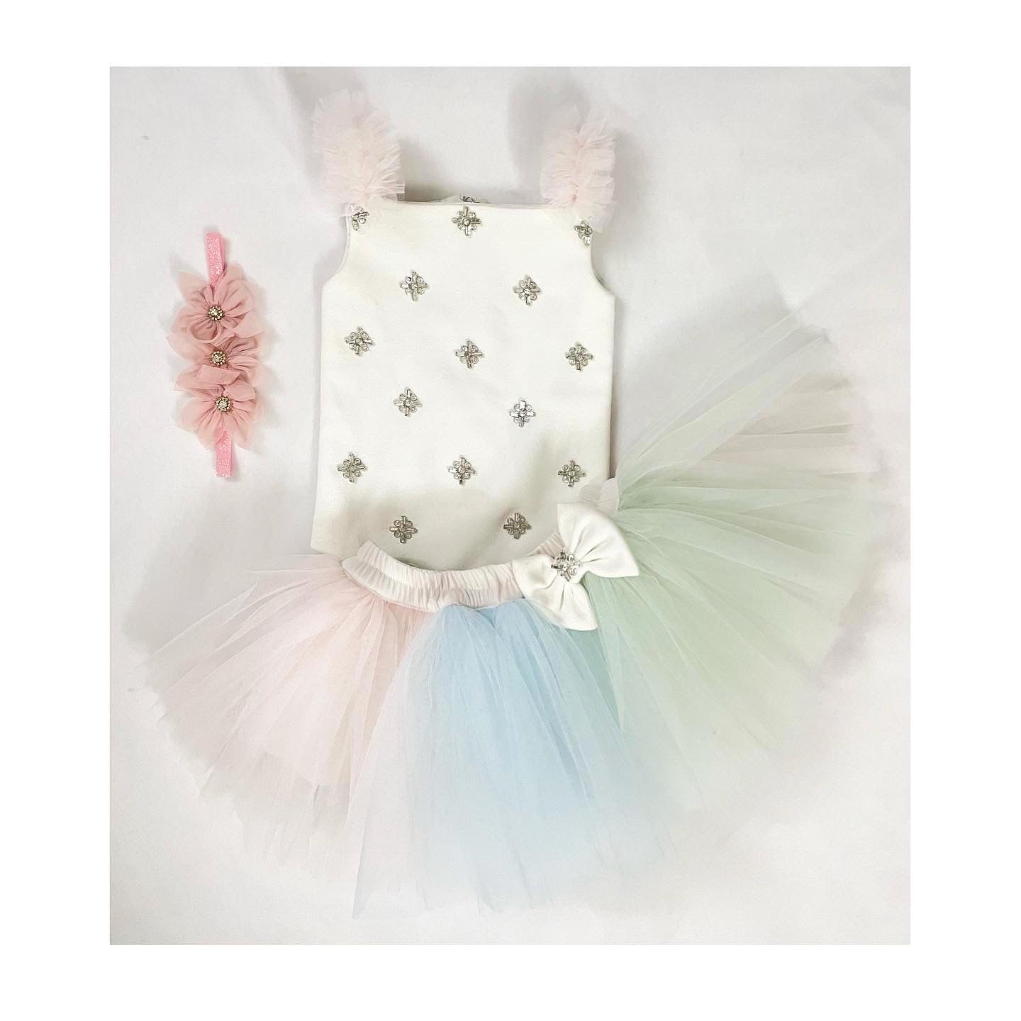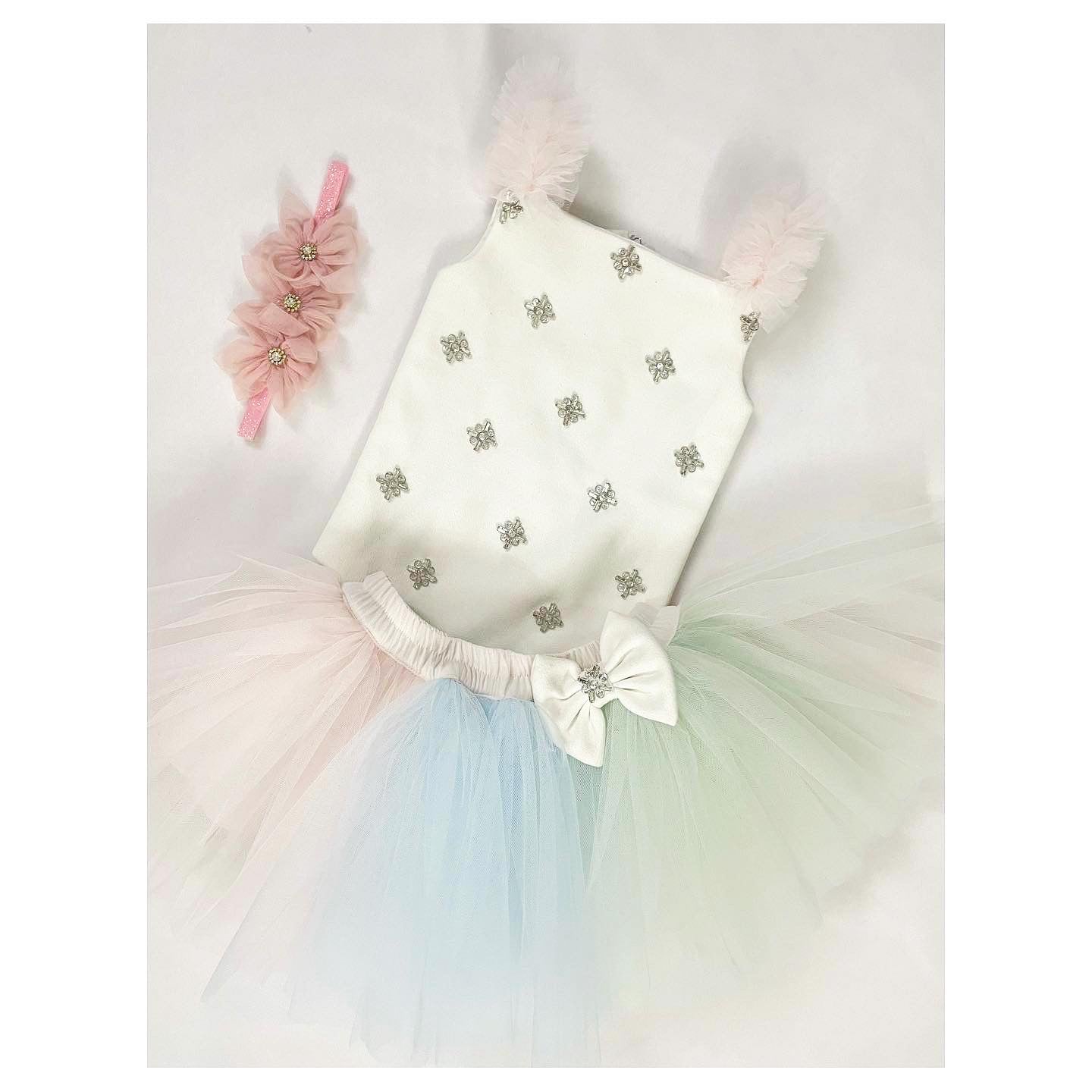 Soft suede romper with 3d hand embroidered diamante , paired with a soft tulle tutu skirt in rainbow colors