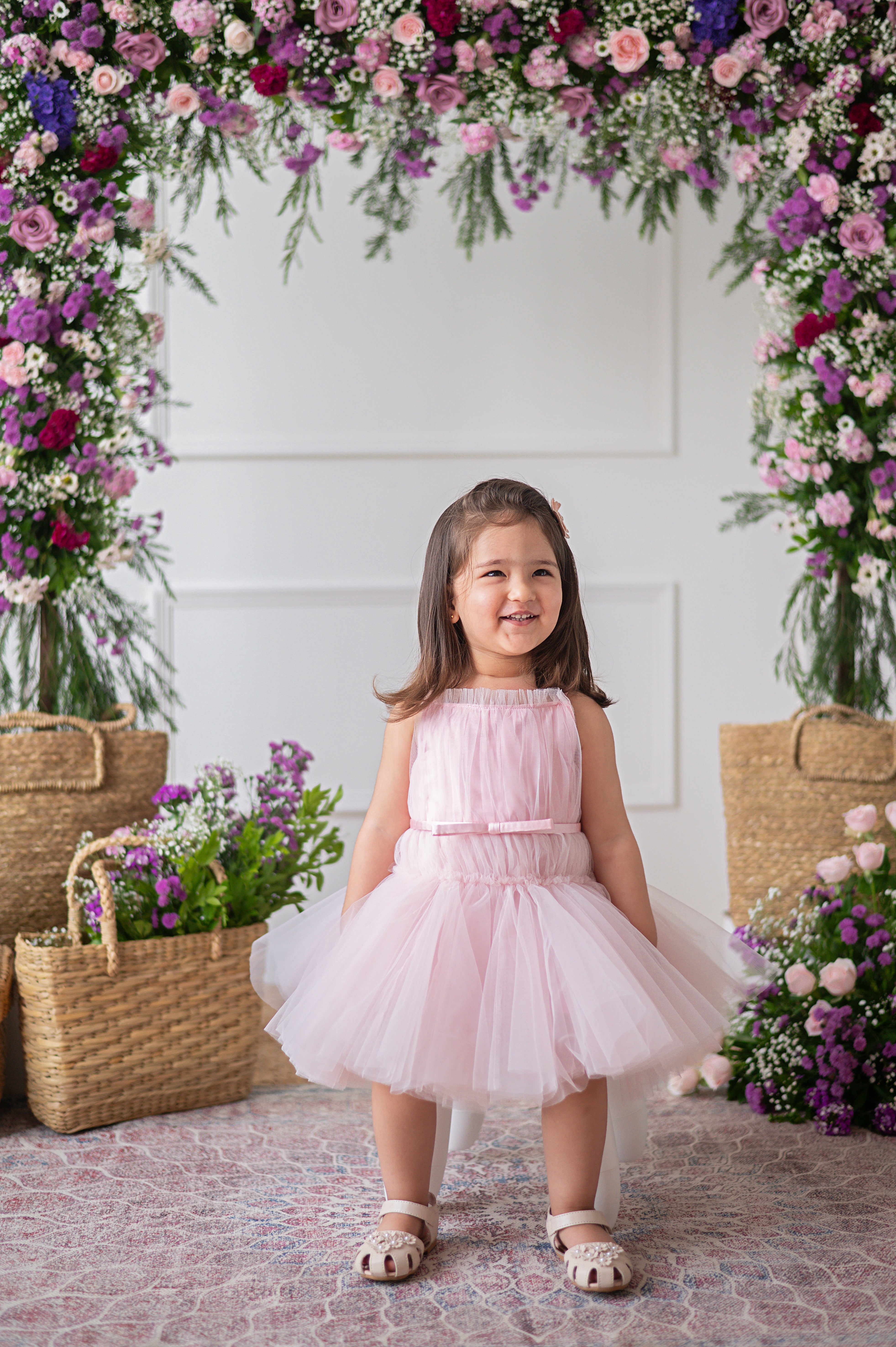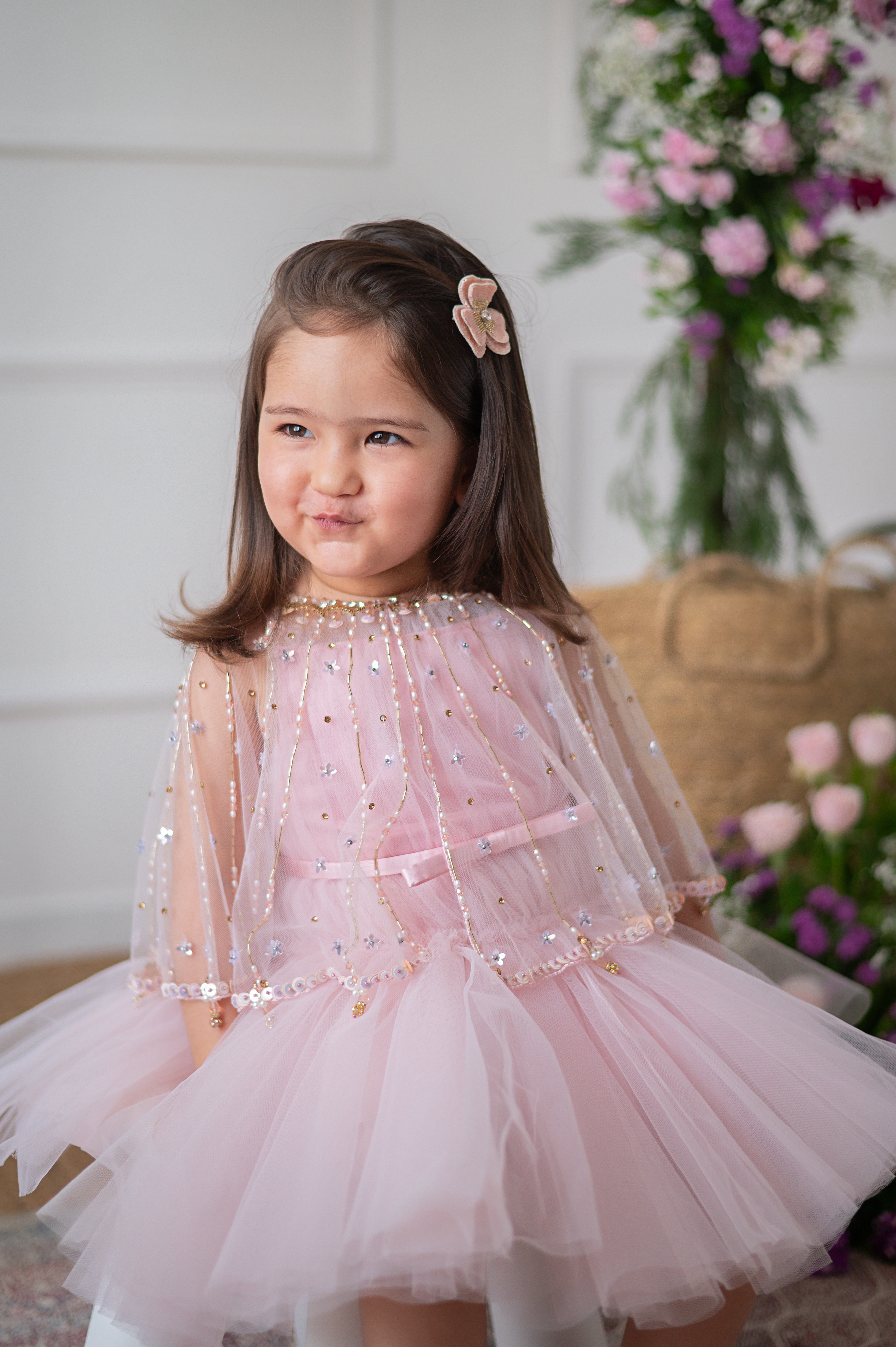 The soft rose pink tulle dress with a hand embroidered cape. The dress can be worn with our without the cape.