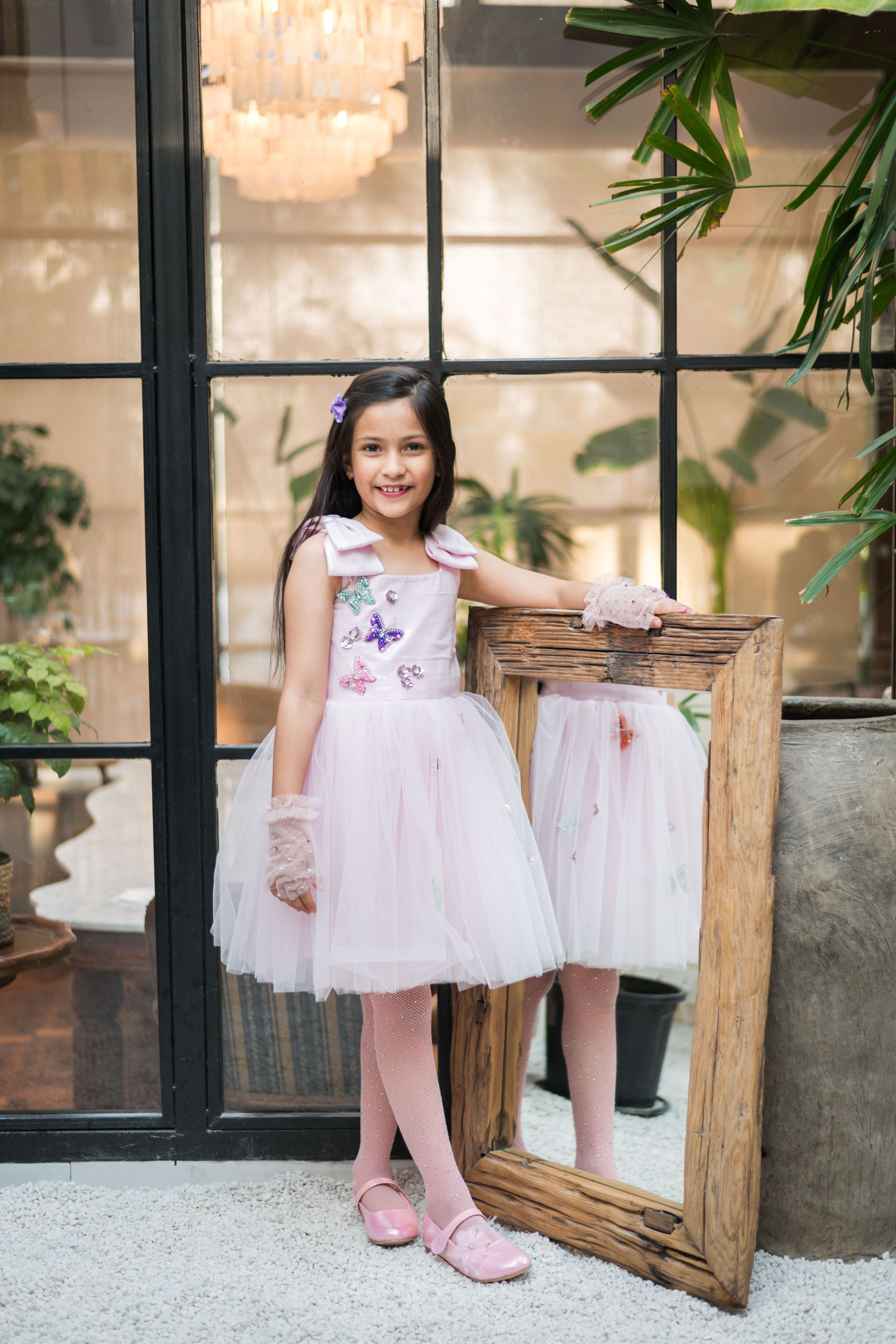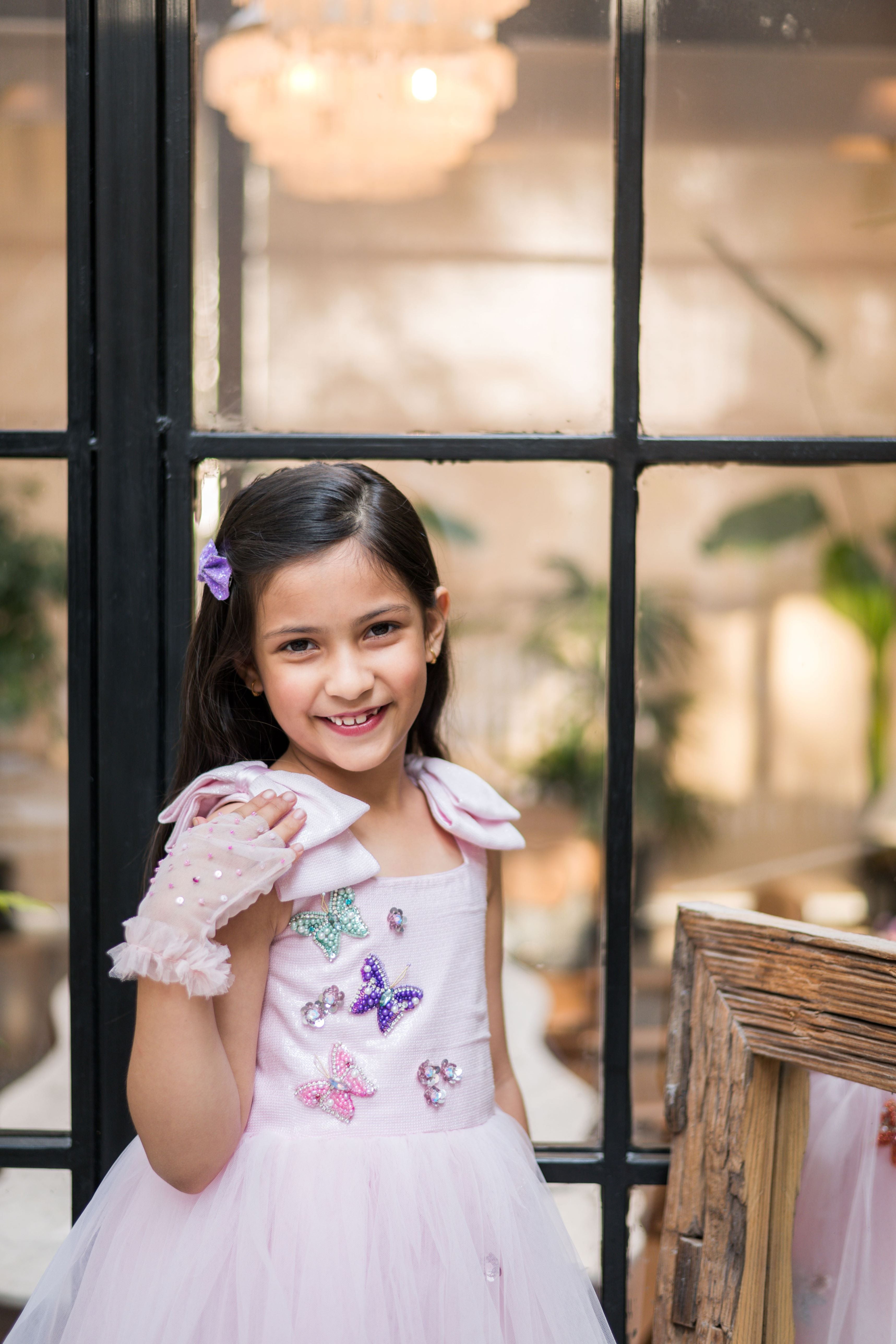 A soft pink sequin bodice dress with colorful butterflies on the bodice. The dress has beautiful bows on the shoulder and is super light weight.