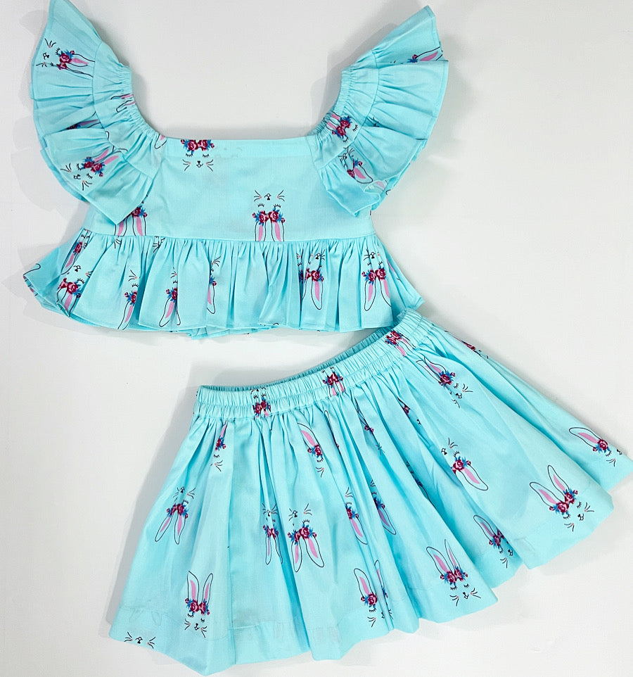 Absolutely delightful ensemble featuring a bunny print pure cotton peplum frill top, exuding charm perfect for summer. The peplum silhouette adds a girly touch, while the playful bunny print adds a delightful flair. Paired with a short skirt, it creates a chic and stylish look, ideal for warm days and outdoor fun!!