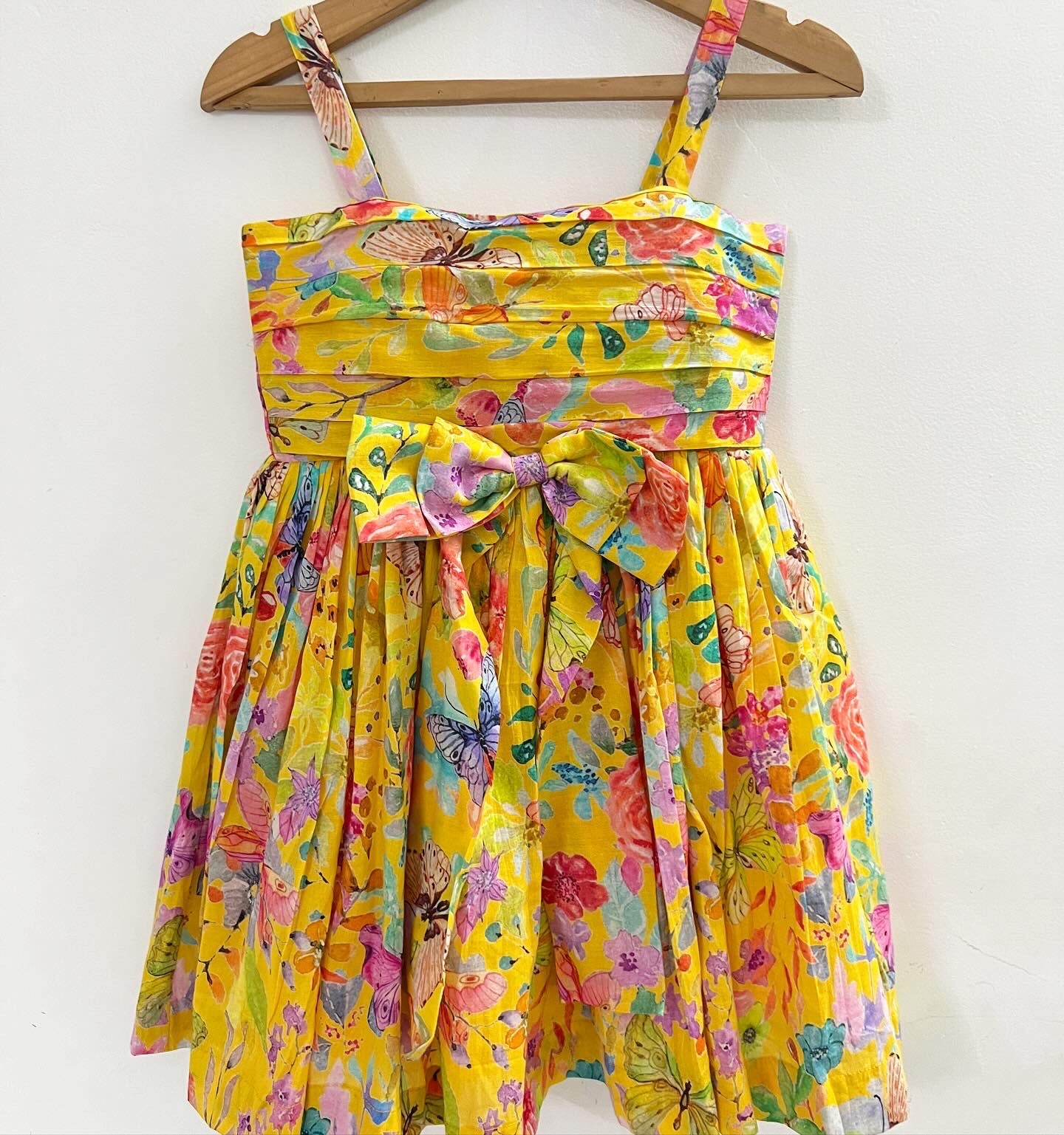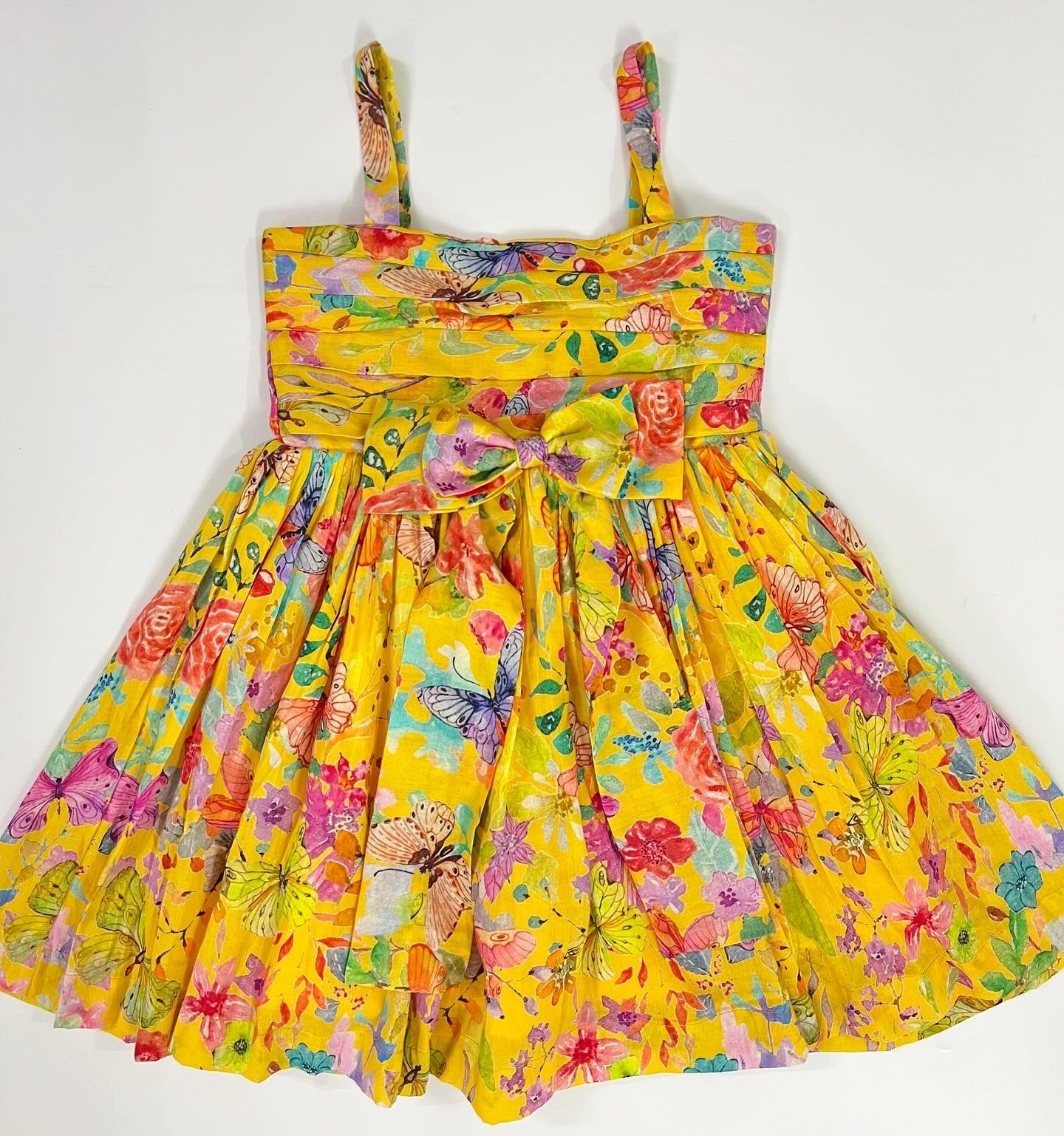 Let your little one flutter through summer in this adorable yellow dress adorned with whimsical floral and butterfly prints. Crafted from the softest mal fabric, it ensures comfort all day long. Complete with a charming bow in the front, it’s the perfect ensemble for easy, breezy days ahead.