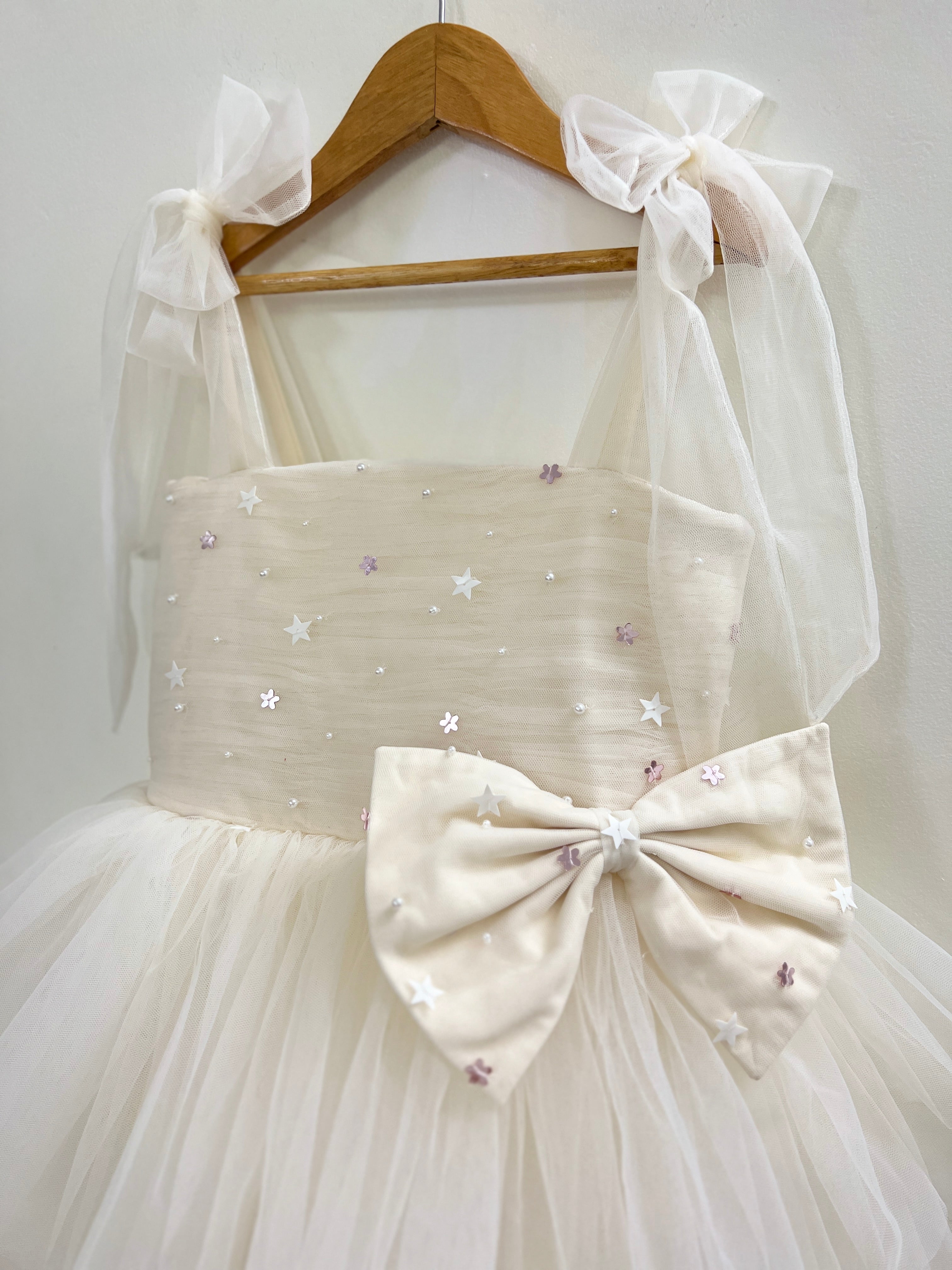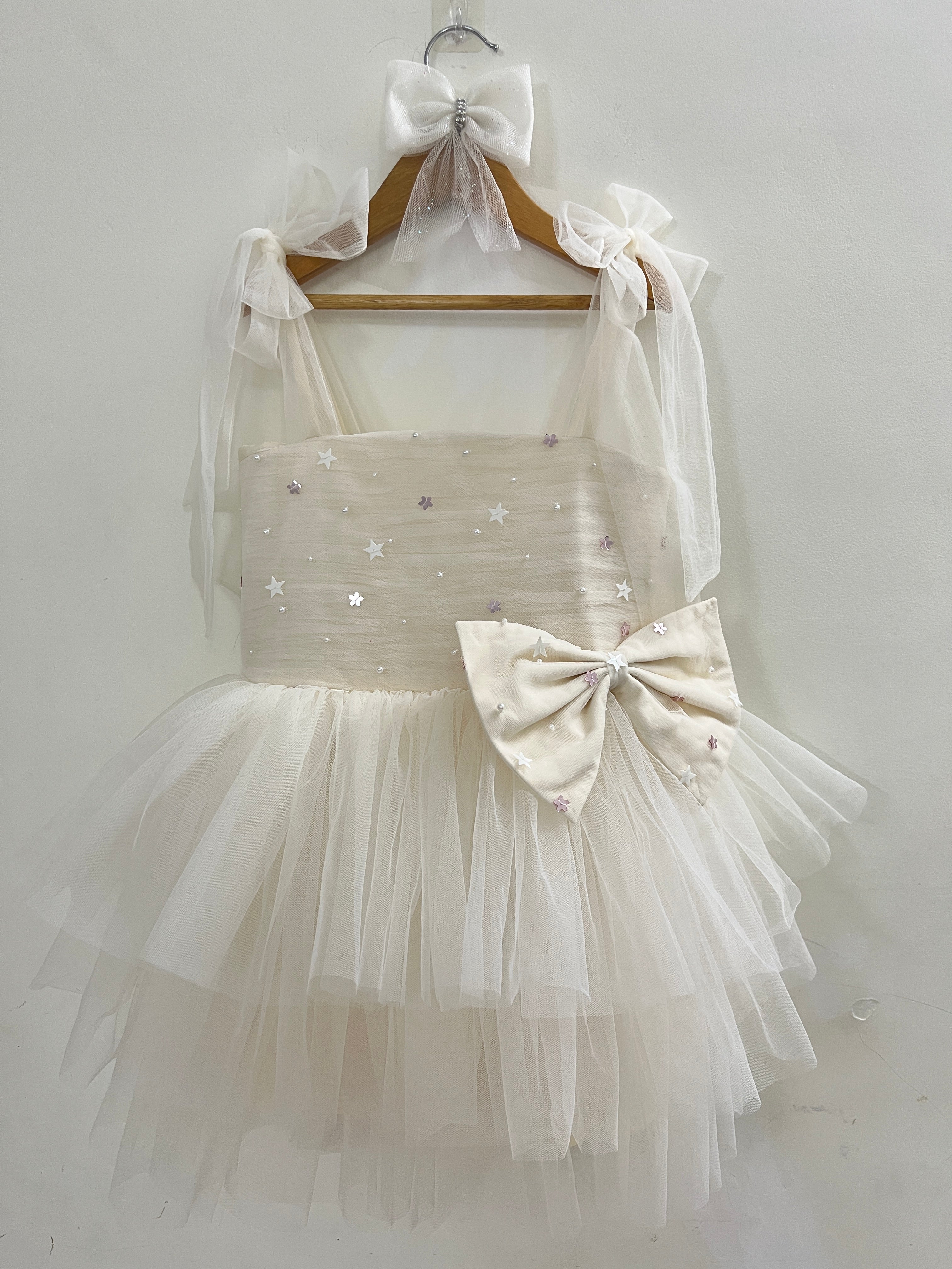 Gorgeous tulle frills dress with bow ties on shoulder and stars embroidered on the bodice